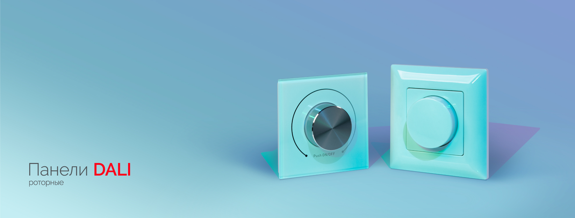 Встраиваемые панели с вращающимся регулятором, работающие по стандарту DALI, предназначены для управления светодиодными лентами, светильниками и другими источниками света, использующими стандартный цифровой интерфейс DALI. Устройства позволяют включать, выключать свет и регулировать яркость или оттенок света.