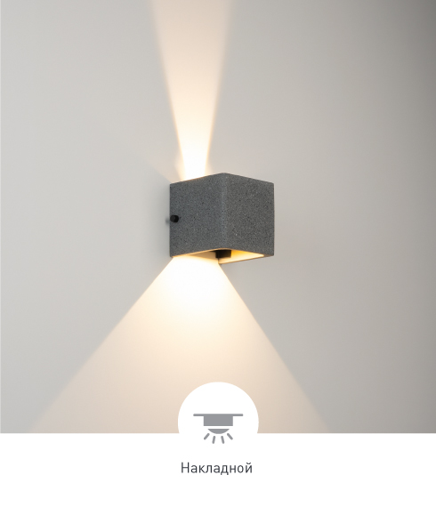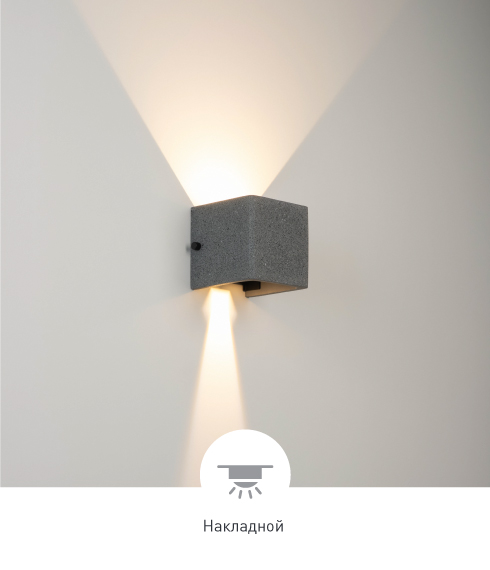 Настенный светильник создает лучи света, направленные вверх и вниз, с теплым цветом свечения (3000 K) и высокой цветопередачей (СRI>90), подчеркивая рельеф поверхности архитектурных сооружений. Кубический корпус выполнен из бетона и гармонично смотрится на фасадах зданий. Угол каждого из лучей регулируется, чтобы формировать выразительные световые акценты на поверхностях стен. Высокая степень защиты IP65 предотвращает попадание влаги и пыли внутрь светильника, что позволяет использовать его под открытым небом.