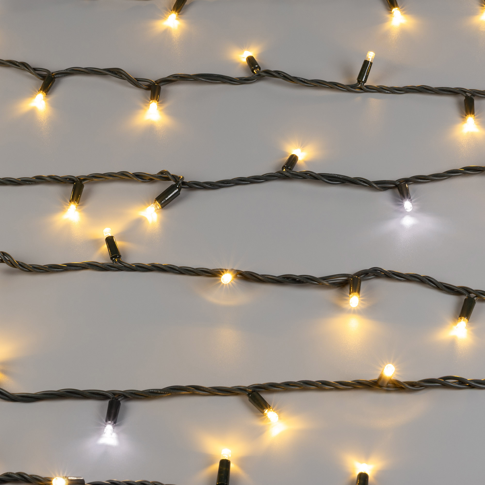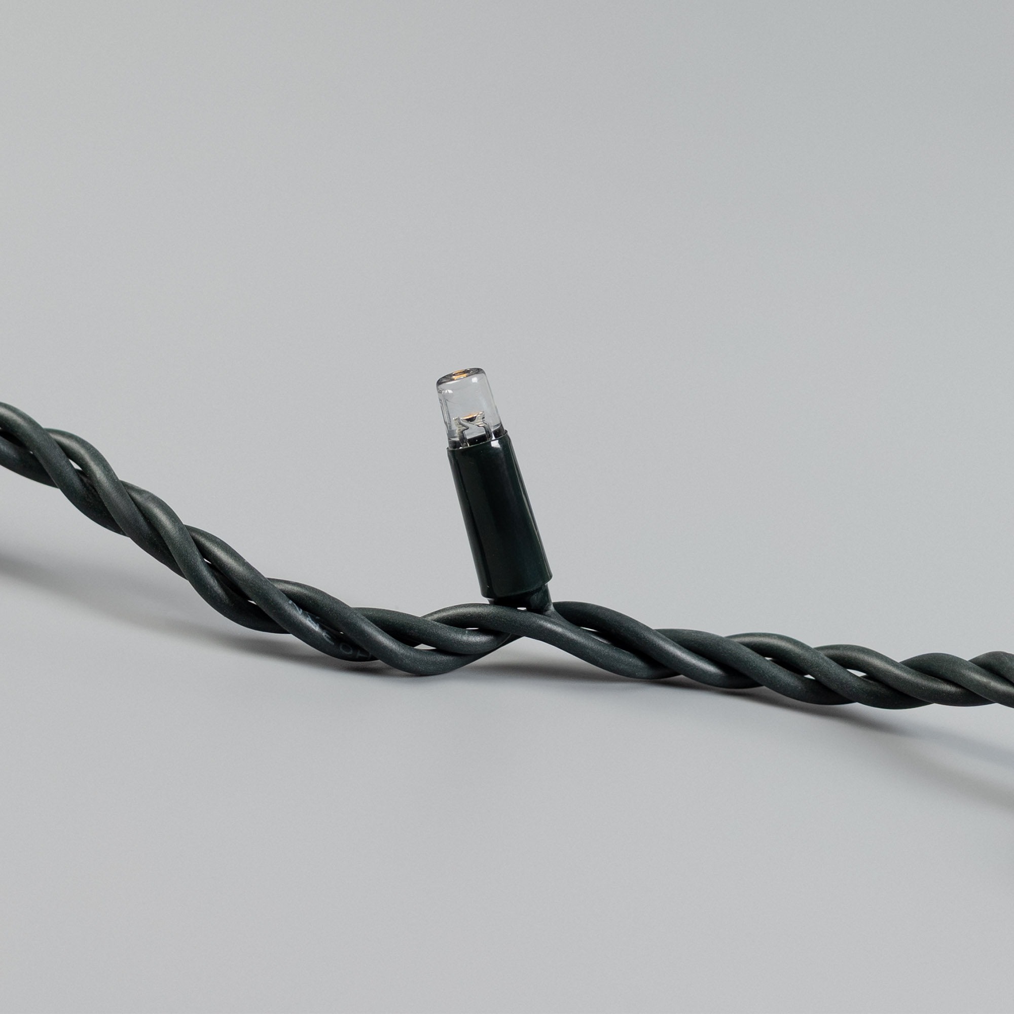 Светодиодная нить Pro. Размер 10000 мм. 100 светодиодов размером 7 мм. Основной цвет свечения ТЕПЛЫЙ БЕЛЫЙ (3000 К), эффект мерцания редких точек (БЕЛЫЙ 6000К) с резким световым рисунком (прозрачная вогнутая линза), соотношение светодиодов: 84 теплых постоянного свечения / 16 белых с мерцанием. Эффект частого мерцания. Провод темно-зеленый, каучук. Питание 230 В, Мощность 7 Вт, защита IP65, применение в помещении и на улице под навесом. Аксессуары для подключения и управления приобретаются отдельно.