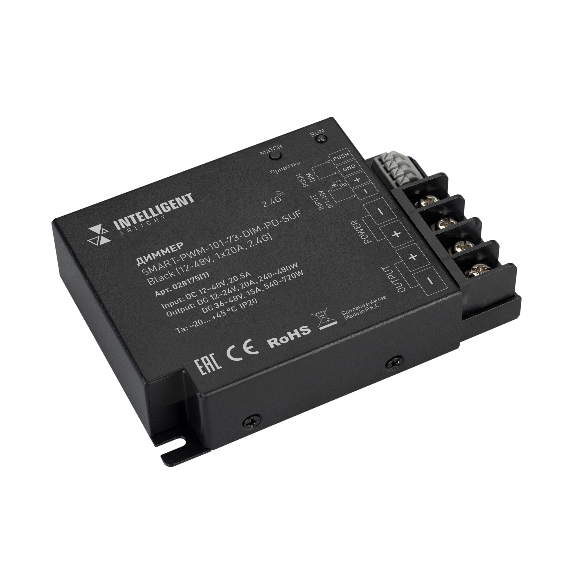 INTELLIGENT ARLIGHT Диммер SMART-PWM-101-73-DIM-PD-SUF Black (12-48V, 1x20A, 2.4G) (IARL, IP20 Металл, 5 лет)