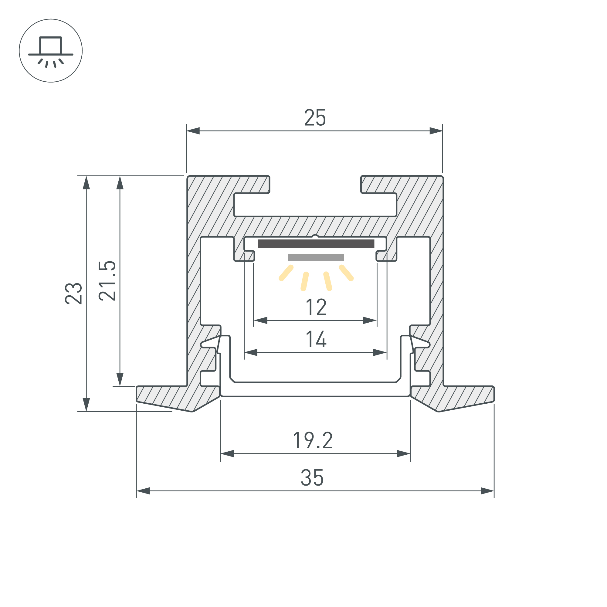 Алюминиевый профиль для светодиодных лент и линеек. Цвет - белый RAL9003 (порошковая окраска). Габаритные размеры (L×W×H): 2500x35,6x23,2 мм, паз для установки 25 мм. Ширина площадки для ленты 12 мм. Экраны, заглушки и другие аксессуары приобретаются отдельно. Цена за 1 метр.
