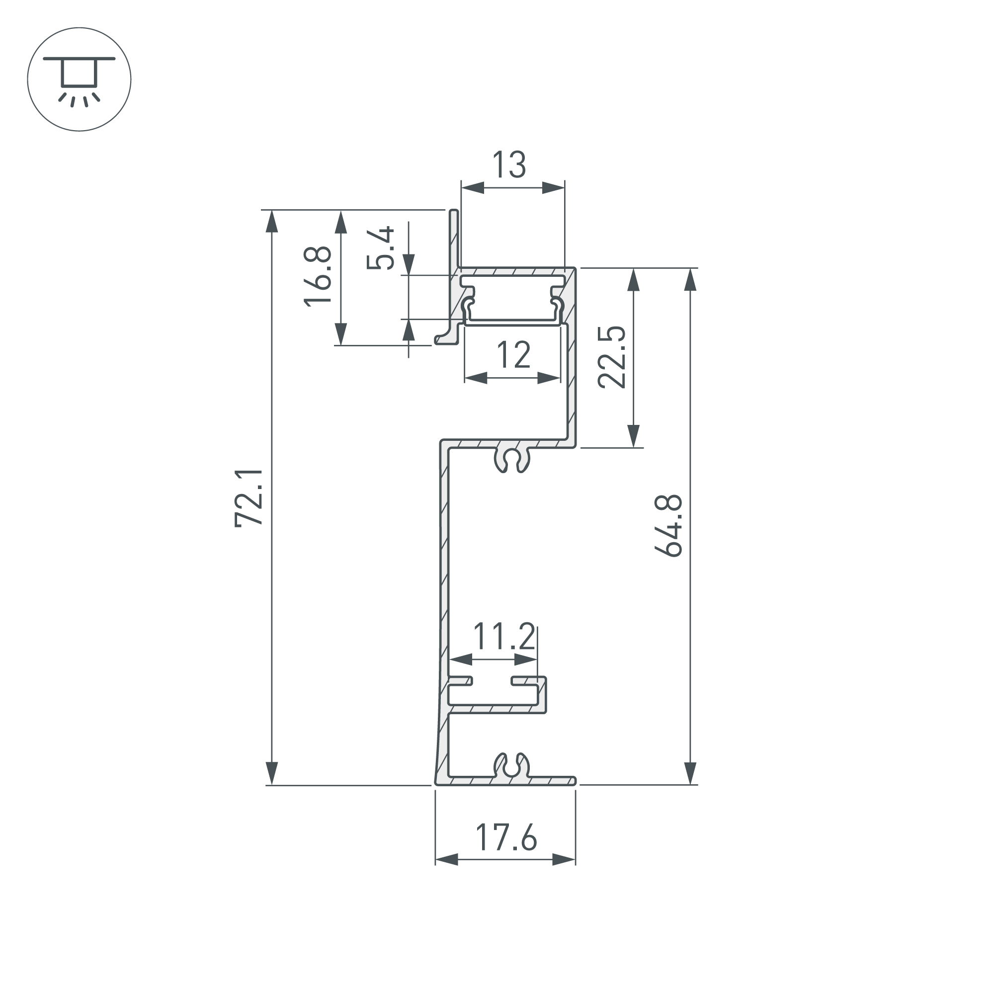 Встраиваемый алюминиевый профиль-плинтус с накладным фланцем белого цвета для создания эффекта парящей стены. Габаритные размеры профиля составляют 2000 мм в длину, 17,6 мм в ширину и 72,1 мм в высоту. Площадка для установки светодиодных лент позволяет использовать ленту шириной до 12 мм и мощностью до 32 Вт/м. Это обеспечивает гибкость в выборе светодиодных лент и создает потрясающие световые решения. Экран, заглушки и другие аксессуары не включены в комплект и приобретаются отдельно. Цена указана за 1 метр профиля. Отличное решение для создания современных световых проектов.