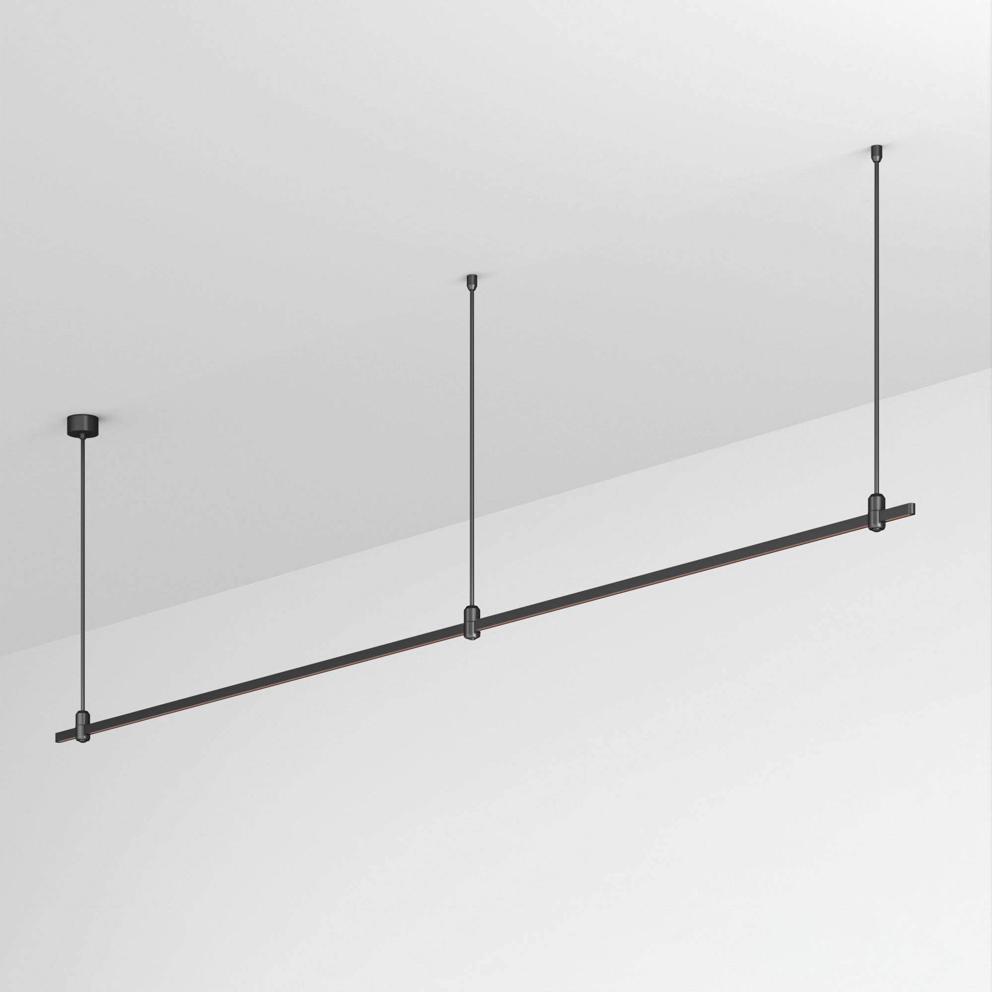 Подвесная линейная конструкция APRIORI. В комплекте трек с аксессуарами и жесткими подвесами длиной 800мм. Размер ДxШxВ: 3000x17x22мм. Размер (с учетом заглушек) ДxШxВ: 3021x17x22мм. Монтируется подвесным способом. Для установки необходима фиксация на потолочной поверхности с использованием трех опорных точек подвеса. Шинопровод рассчитан на работу с безопасным напряжением DC48В. Изготавливается из алюминия, цвет черный. Светильники и источники питания приобретаются отдельно.