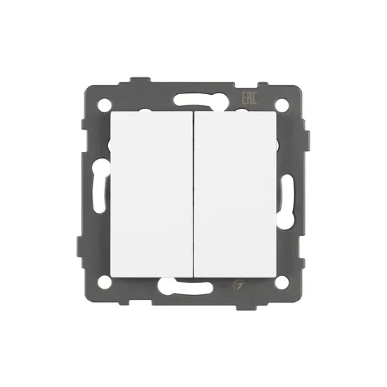 Механизм выключателя света клавишный на 1 пост 2 возвратные клавиши. Цвет - белый. Без фронтальной рамки. Уровень пылевлагозащиты IP20. Выключатель устанавливается в стандартный круглый подрозетник.