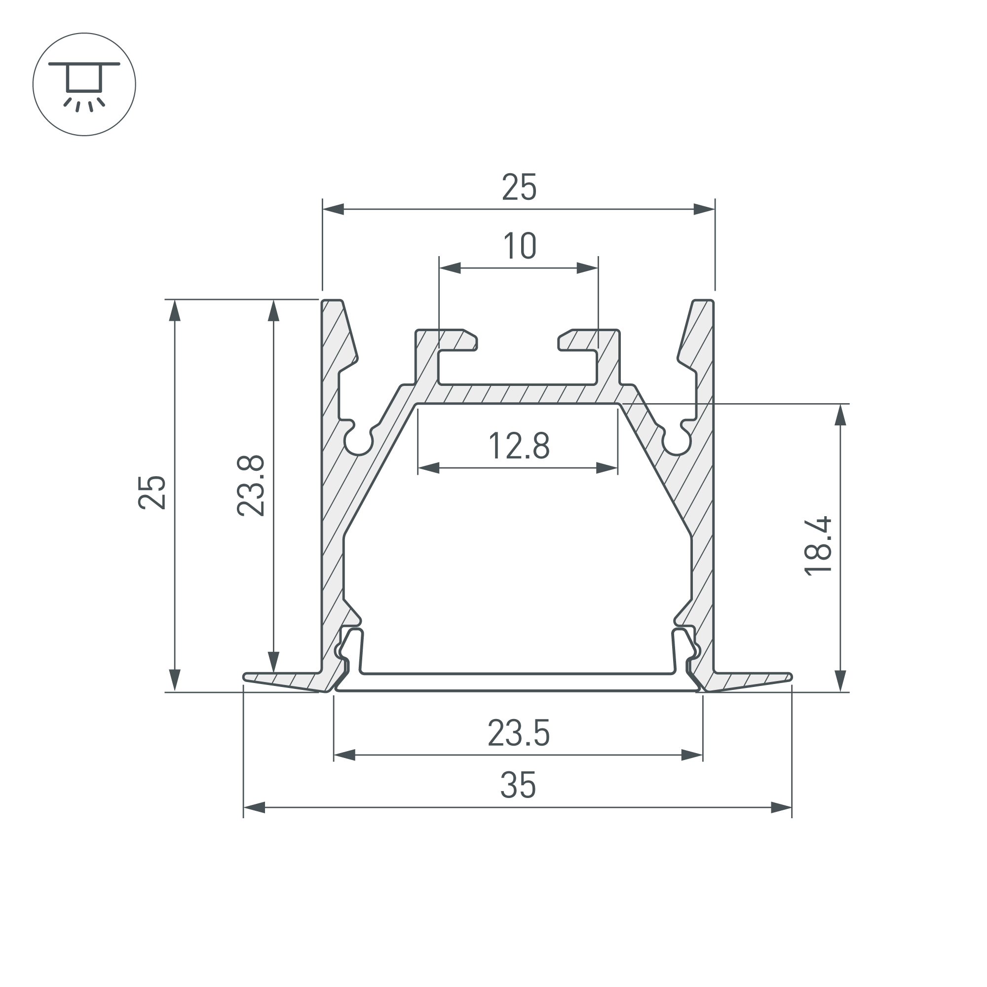 Встраиваемый профиль с накладным фланцем из анодированного алюминия для основной и контурной подсветки помещений. Габаритные размеры профиля составляют 2000 мм в длину, 35 мм в ширину и 25 мм в высоту, паз для установки 25 мм. Площадка для установки светодиодных лент позволяет использовать ленту шириной до 12,8 мм и мощностью до 27 Вт/м. Это обеспечивает гибкость в выборе светодиодных лент и создает потрясающие световые решения. Экраны, заглушки и другие аксессуары не включены в комплект и приобретаются отдельно. Цена указана за 1 метр профиля. Отличное решение для создания современных световых проектов.