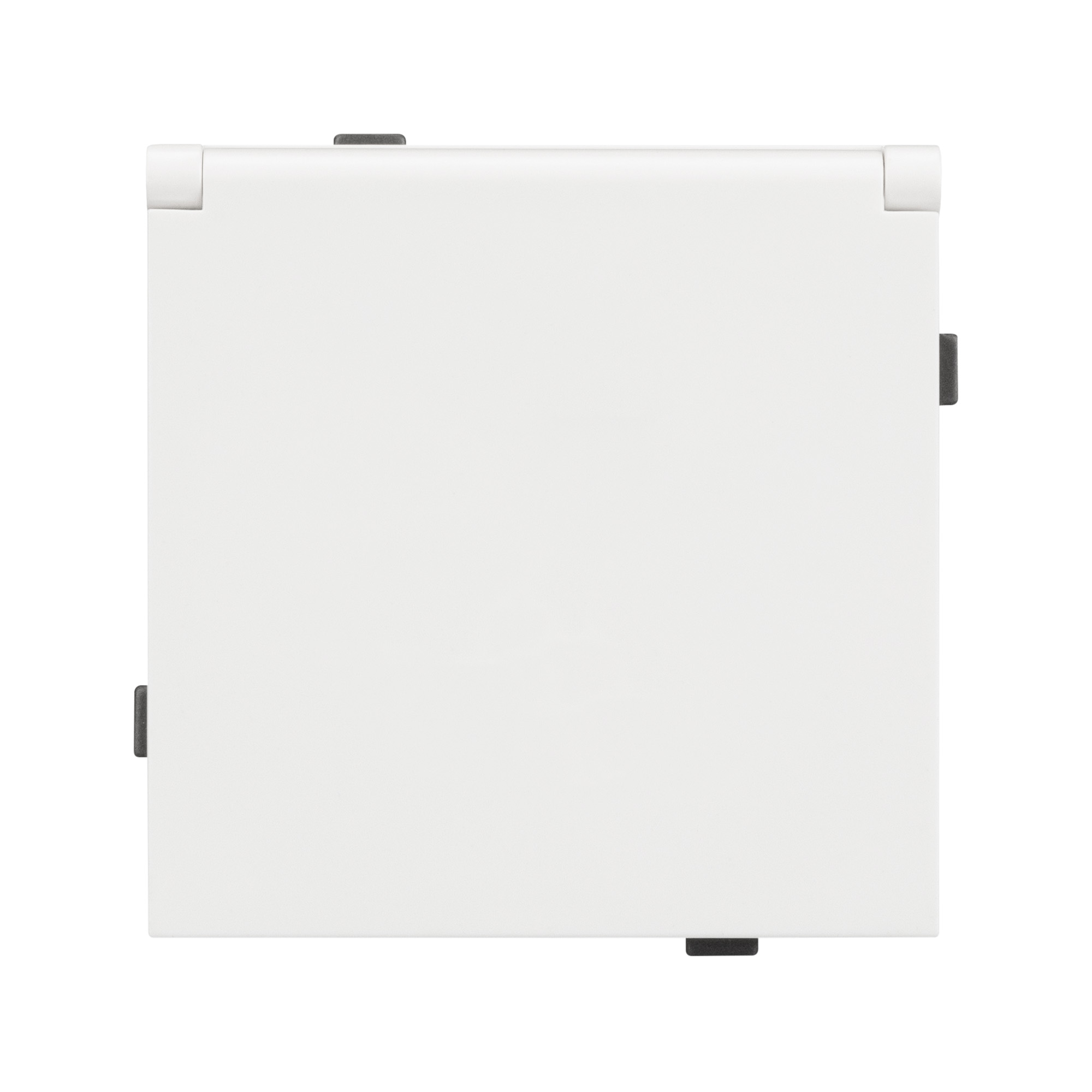 Механизм розетки с заземлением и влагозащитной крышкой на 1 пост. Цвет - белый, с Soft-Touch покрытием. Без фронтальной рамки. Уровень пылевлагозащиты IP44. Розетка устанавливается в стандартный подрозетник круглого сечения диаметром 60мм.