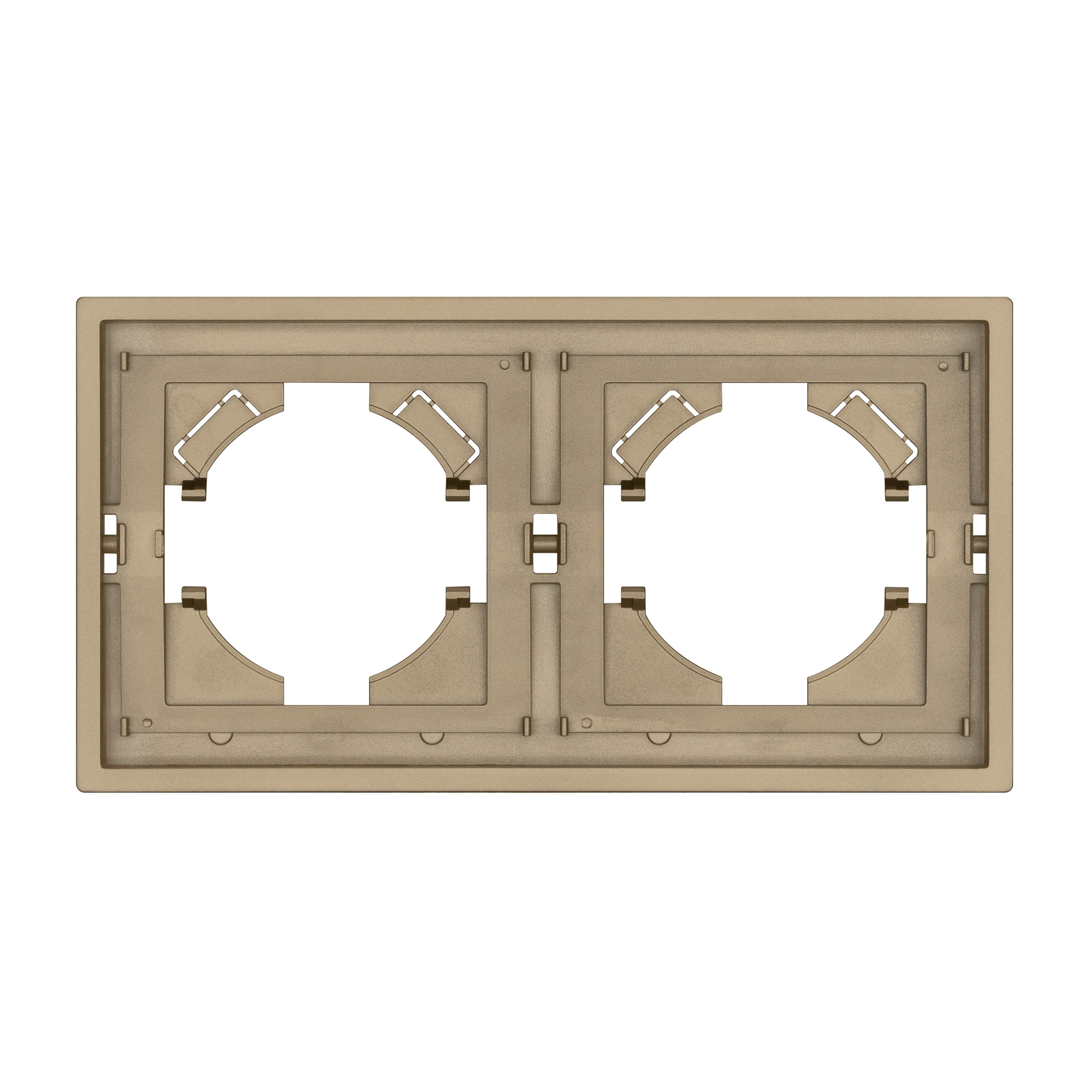 Рамка пластиковая на 2 поста, под встраиваемый механизм. Цвет - золотой, с Soft-Touch покрытием. Среднего уровня герметичности IP20. Ориентация монтажа горизонтальная.