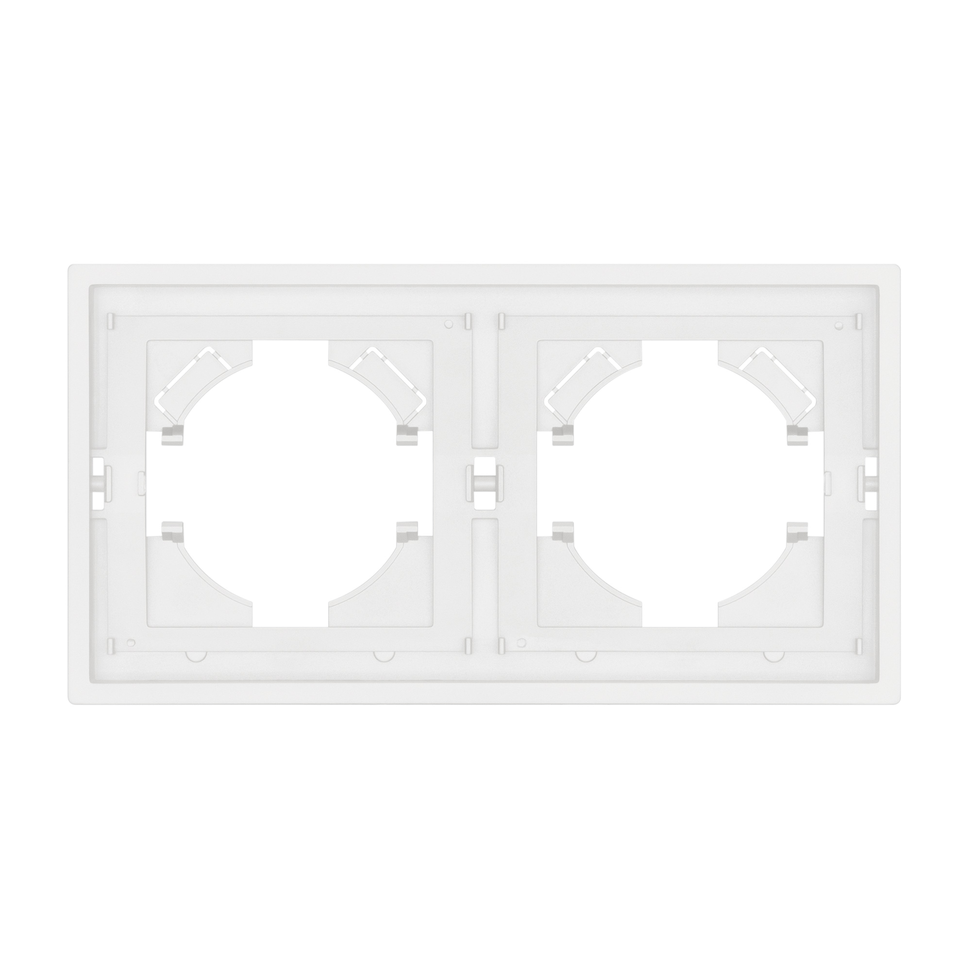 Рамка пластиковая на 2 поста, под встраиваемый механизм. Цвет - белый, с Soft-Touch покрытием. Среднего уровня герметичности IP20. Ориентация монтажа горизонтальная.