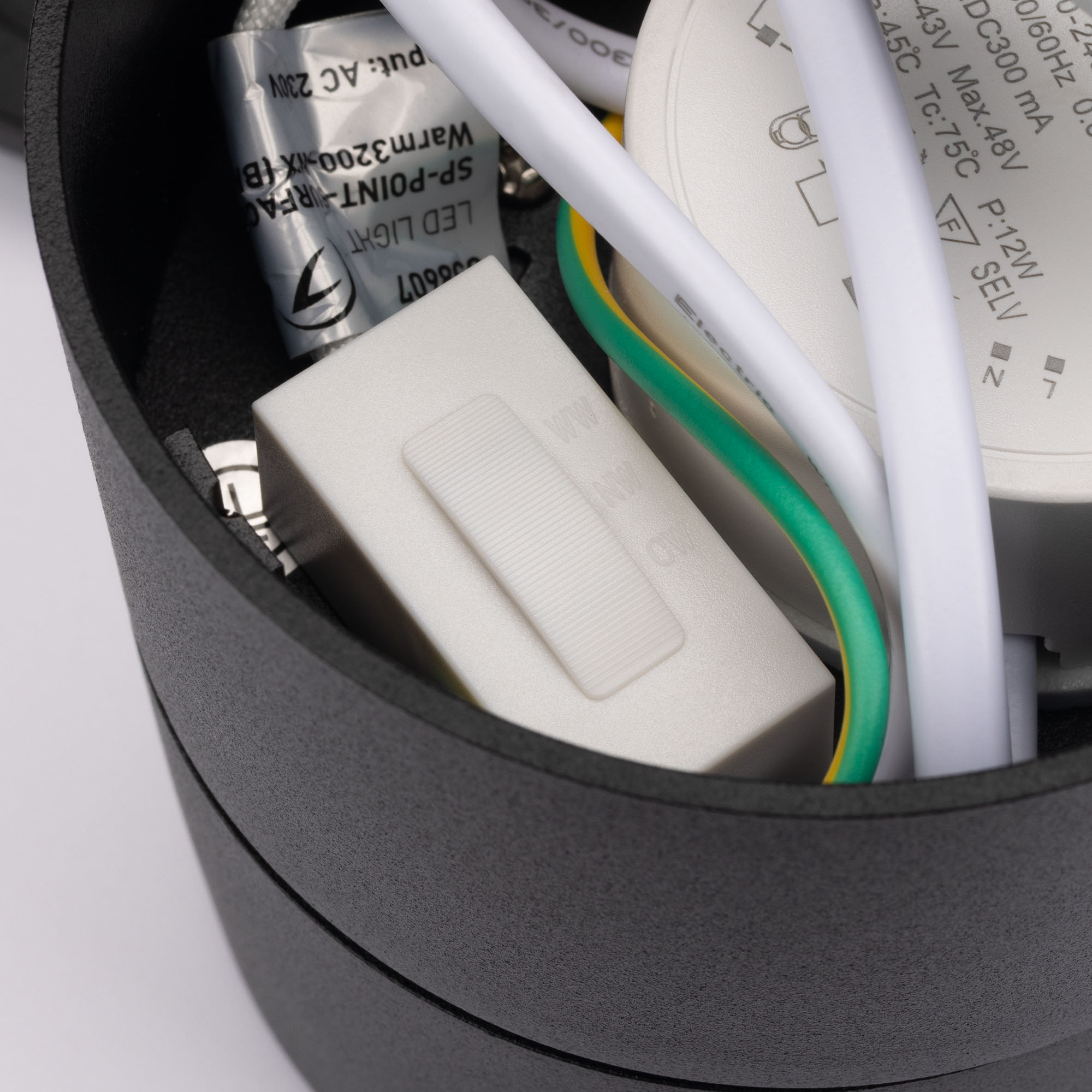 Накладной откидной поворотный светильник с изменяемой цветовой температурой. Мощность 12 Вт, св. поток с решеткой honeycomb 960 лм, св. эффективность 80 лм/Вт, теплый 2700 K, теплый 3200 K, дневной 4000K (переключается), CRI>90, угол свечения 36°, угол поворота 360°, угол наклона 90°. Черный круглый корпус из алюминия, степень защиты IP20. Размер: диаметр Ø85 мм, высота 95 мм. Питание AC 220-240V, 12Вт, драйвер встроенный (300mA, 27-43V). Пульсация <1%.