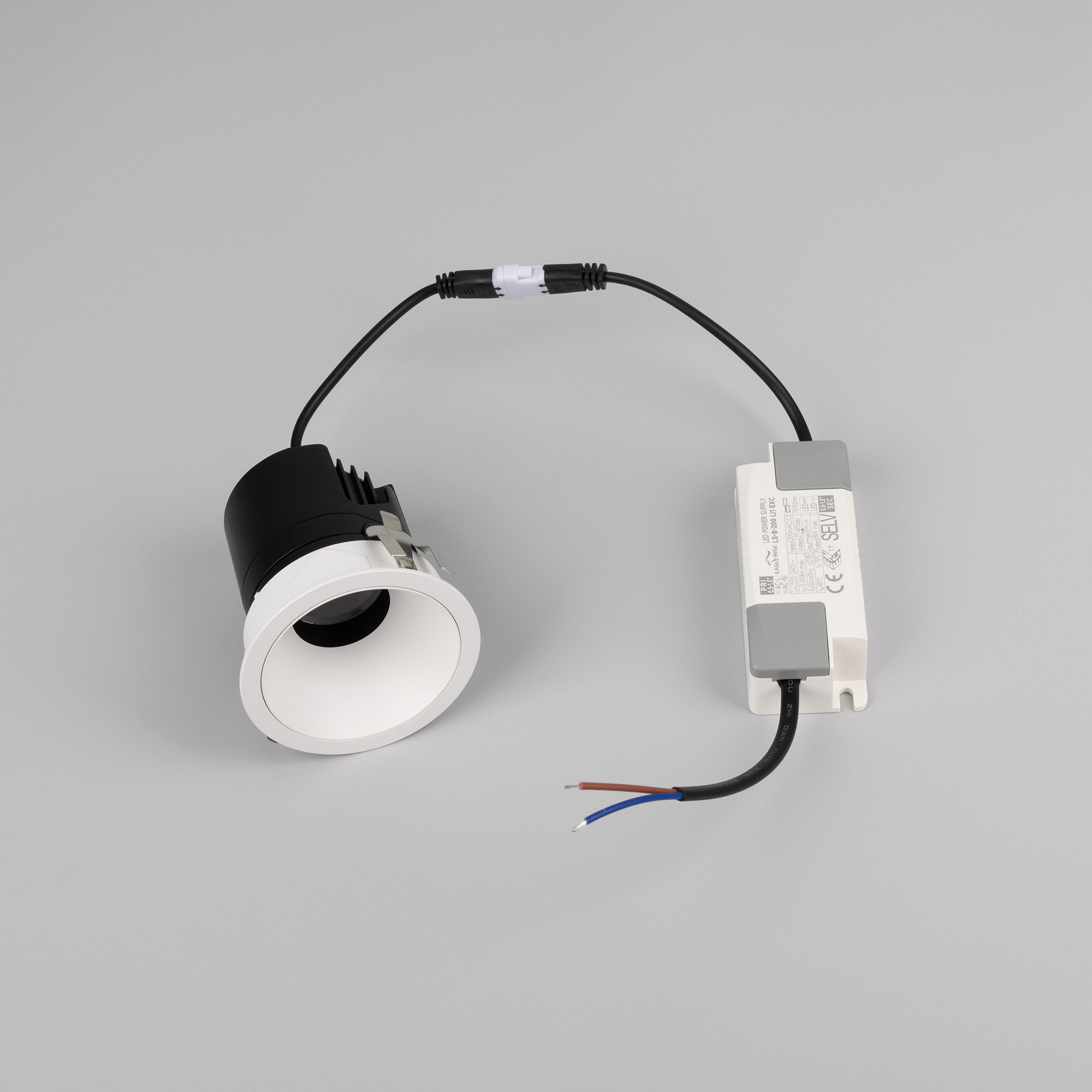 Встраиваемый светильник даунлайт. Мощность 9 Вт, св. поток 710 лм, 78 лм/Вт, теплый 3000 K, CRI>92, угол 55°, напряжение питания 230 В. Белый круглый корпус из алюминия, белый матовый отражатель, степень защиты IP20 . Размер: диаметр 72 мм, высота 76 мм. Монтаж встраиваемый, установочное отверстие: диаметр 65 мм. Драйвер 27-40 В, 200 мА, пульсация <0,5%.
