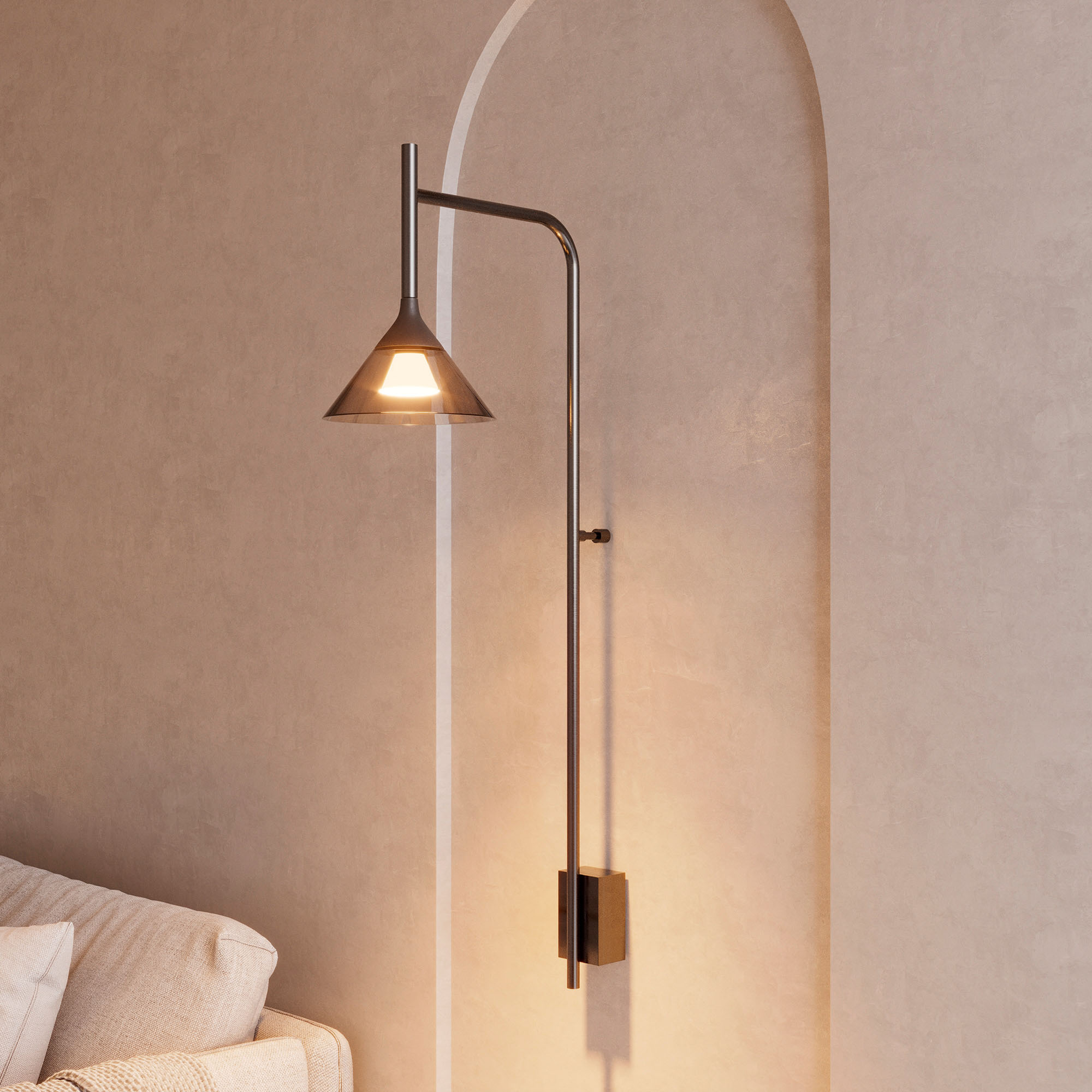 Настенный светильник. Мощность 7 Вт, св. поток 355 лм, 50 лм/Вт, теплый 3000К, CRI>94, угол 30°, напряжение питания 230 В. Черный корпус из алюминия с конусообразным стеклянным плафоном дымчатого цвета, степень защиты IP20. Размеры: диаметр плафона 200 мм, высота плафона 180 мм, высота светильника 1010 мм. Монтаж настенный. Драйвер 12В, 750 мА, пульсация <1%.