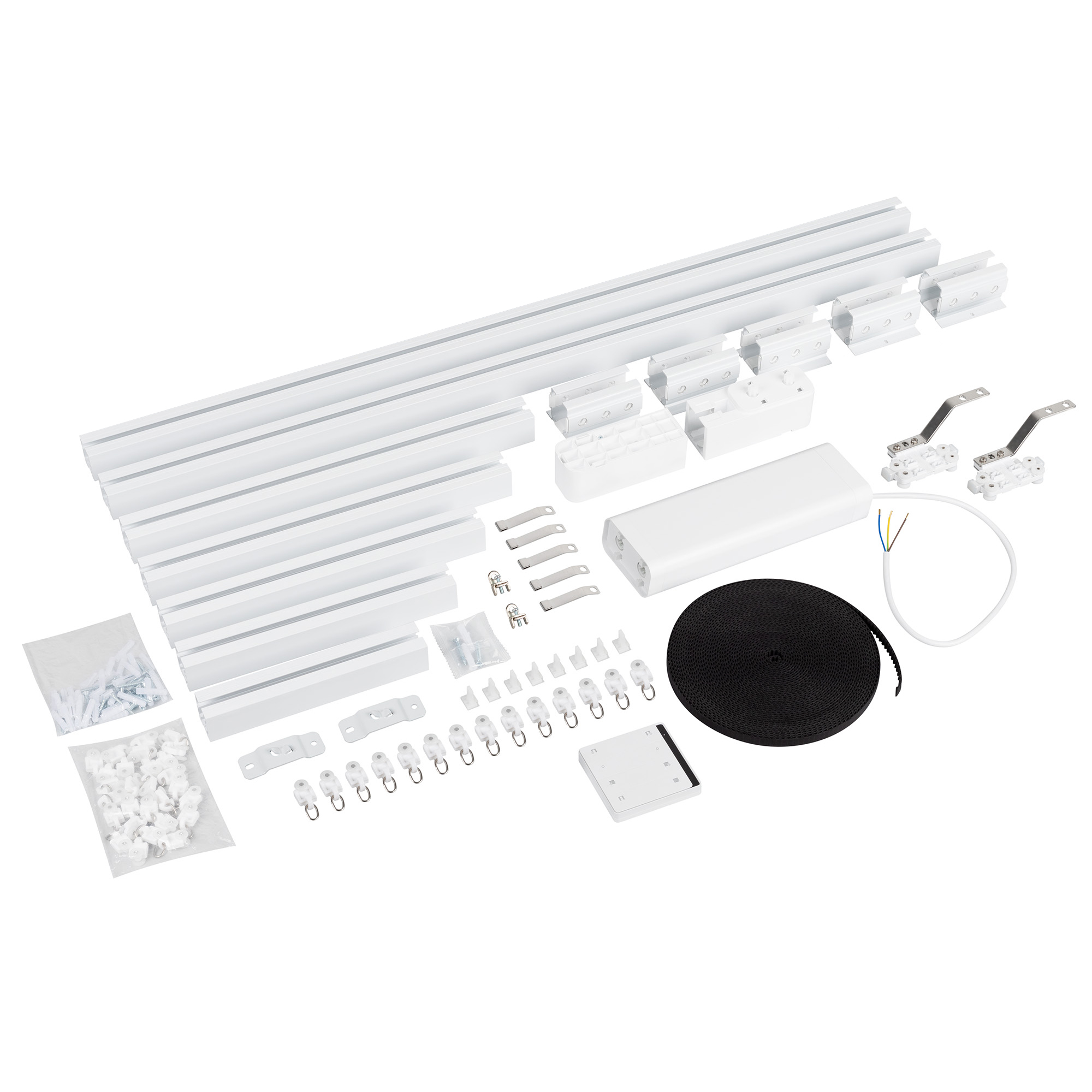 Комплект электрокарниза с независимым управлением двух сторон длиной до 3м (регулируется наборными частями) для раздвижных штор, состоящий из мотора, наборного алюминиевого трека, пульта и комплектующих. Электропривод с питанием 110-240В, мощность 48Вт, момент 3Нм. Управление с помощью панели из комплекта. Ремень из комплекта находится на дне коробки. 1 мотор, 1 пульт дистанционного управления, алюминиевый профиль 1,6 мм (0.9м 2 шт., 0.4м 1 шт., 0.35м 1 шт, 0.3м 1 шт, 0.25м 1 шт, 0.2м 1 шт), 5 соединителей 10 см, 2 шкива, ремень 14м, 2 направляющих бегунка, 26 бегунков, 2 фиксатора, 2 кронштейна, 4 крюка, 27 саморезов с дюбелями