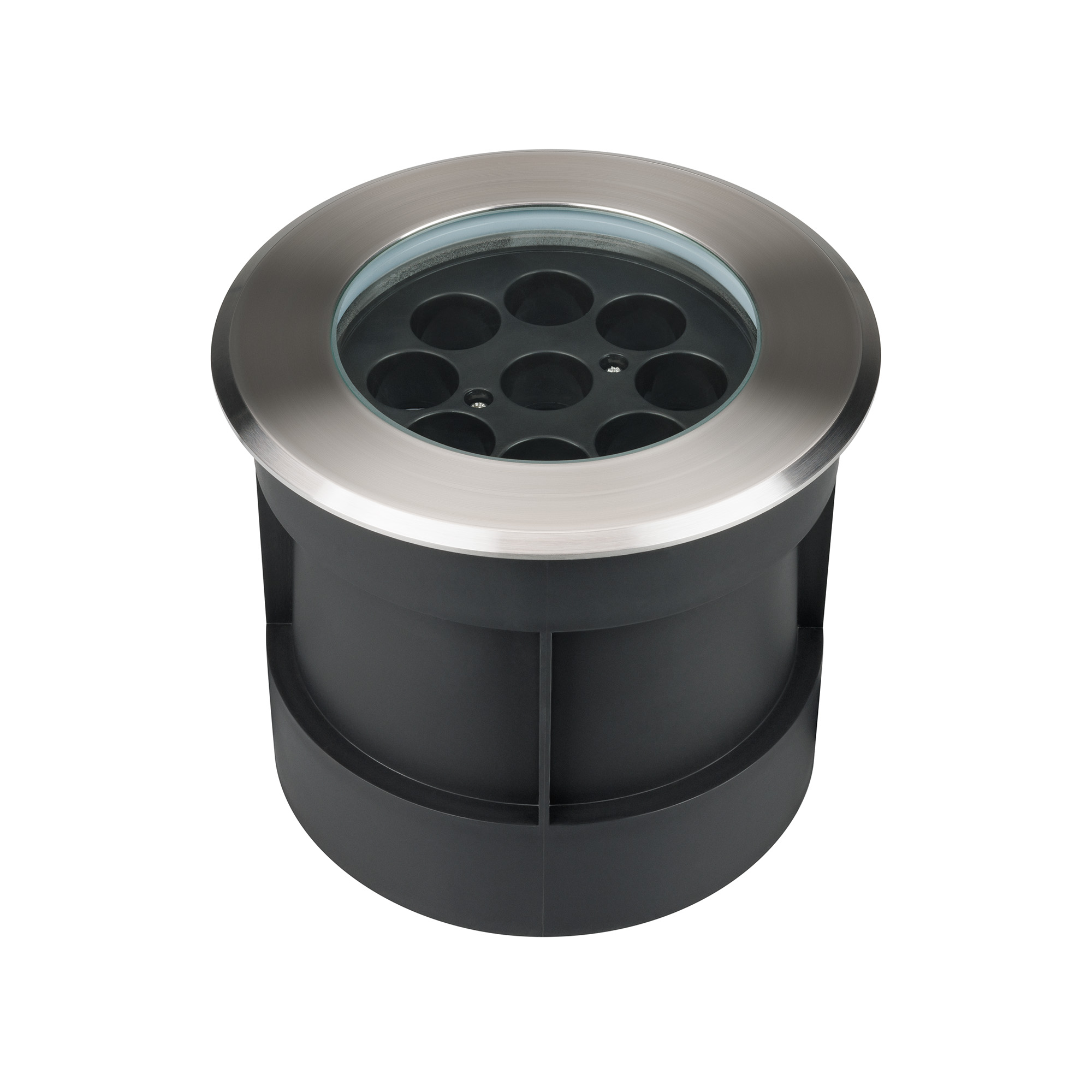 Встраиваемый светодиодный светильник для грунта и пола. Мощность 16Вт, световой поток 1440 лм, цвет теплый 3000К. CRI(Ra)>80, угол 10°. Круглый влагозащищенный корпус IP67, нержавеющая сталь. Экран закалённое стекло. Питание 230В, 16Вт. Размер DxH Ø160x135мм. Установка в отверстие DxH Ø146x130мм.