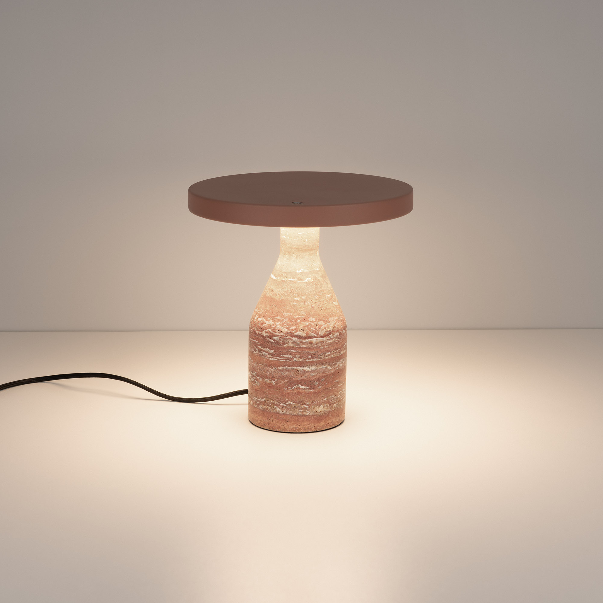Настольный светильник CROOD. С изменяемой цветовой температурой 2700/3200/4000K. Цт переключается коротким нажатием на сенсорную кнопку на плафоне, диммирование происходит за счет ее удержания. Мощность 7 Вт, св. поток 159 лм, 23 лм/Вт, теплый 3000 K, CRI>94, угол 140°, напряжение питания 230 В. Красный плафон из алюминия, основание из травертина, степень защиты IP20. Общая высота 240 мм. Габариты светового модуля DхH: 225 x 22 мм. Габариты основания DхH:: 100 x 220 мм. Пульсация <1%.