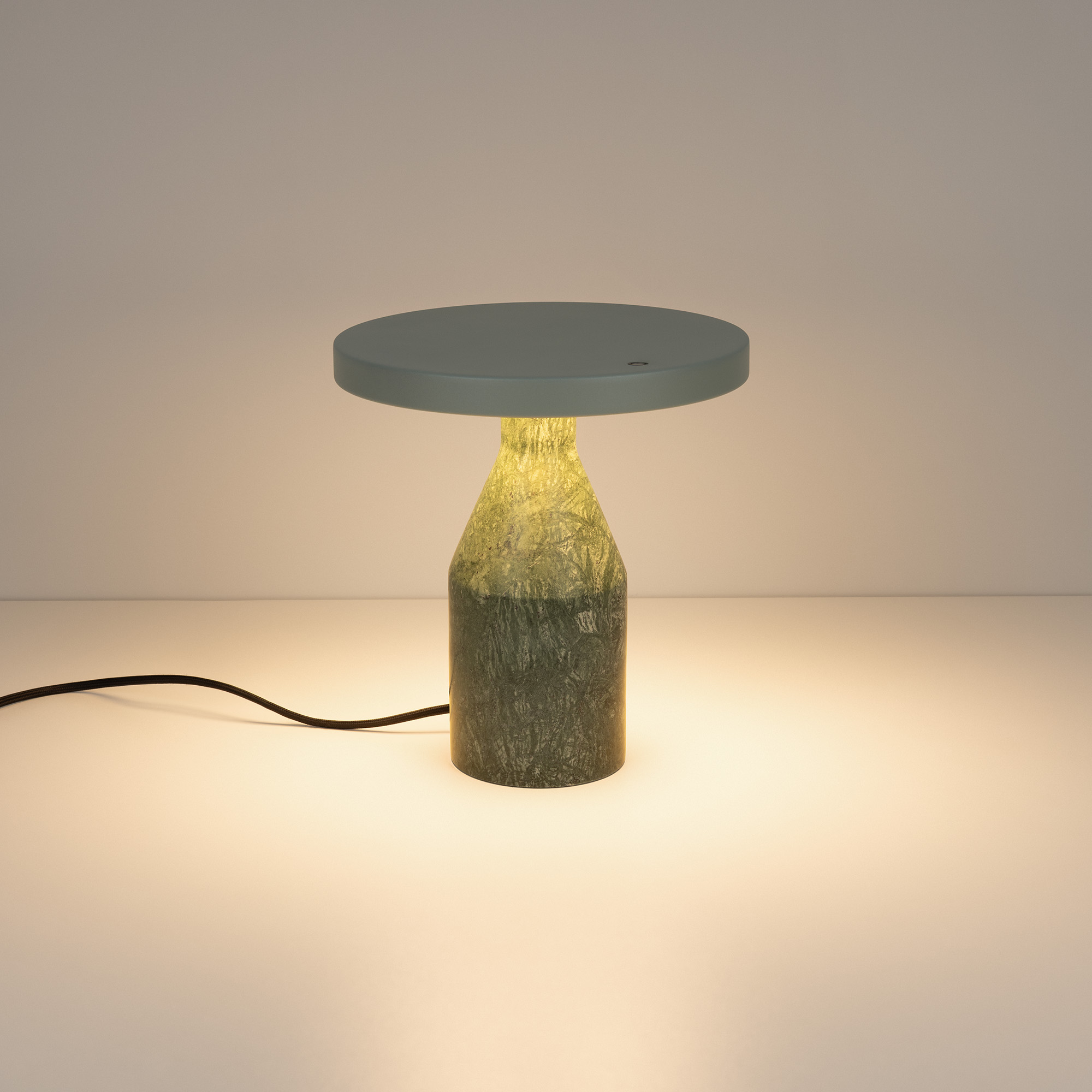 Настольный светильник CROOD. С изменяемой цветовой температурой 2700/3200/4000K, переключается коротким нажатием на сенсорную кнопку на плафоне, диммирование происходит за счет ее удержания. Мощность 7 Вт, св. поток 159 лм, 23 лм/Вт, CRI>94, угол 140°, напряжение питания 230 В. Светло-синий плафон из алюминия, основание из мрамора, степень защиты IP20. Общая высота 240 мм. Габариты светового модуля DхH: 225 x 22 мм. Габариты основания DхH:: 100 x 220 мм. Пульсация <1%.