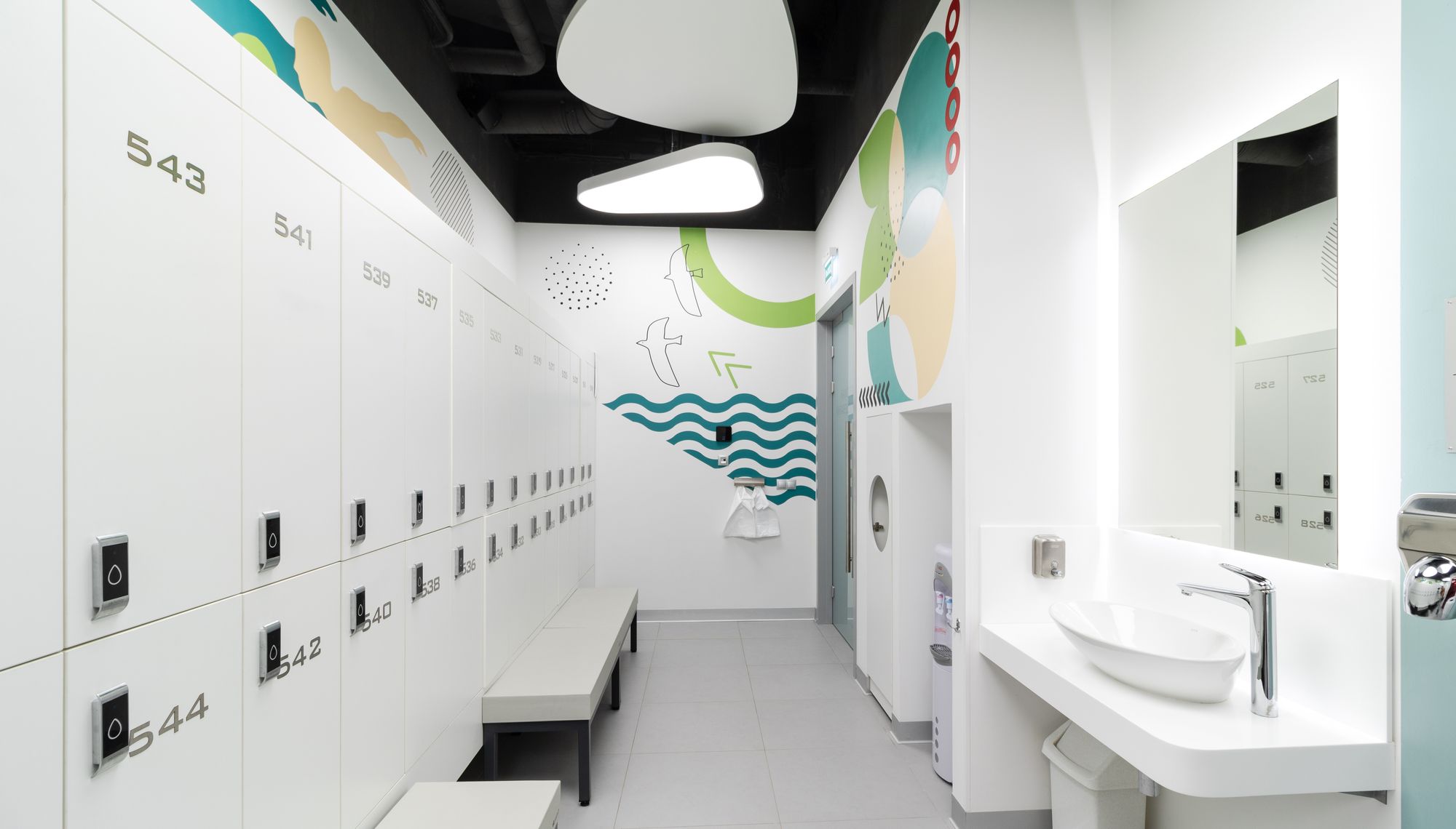 Световой дизайн построен на контрасте белого и красного, широких световых полос и тонких линий света. Линейные светильники с полупрозрачными экранами идеальны для основного освещения. Декоративная подсветка зеркал и других элементов интерьера выполнена светодиодными лентами дневного белого свечения. Границы потолка и стен в фитнес-зонах эффектно подчеркнуты линиями света.