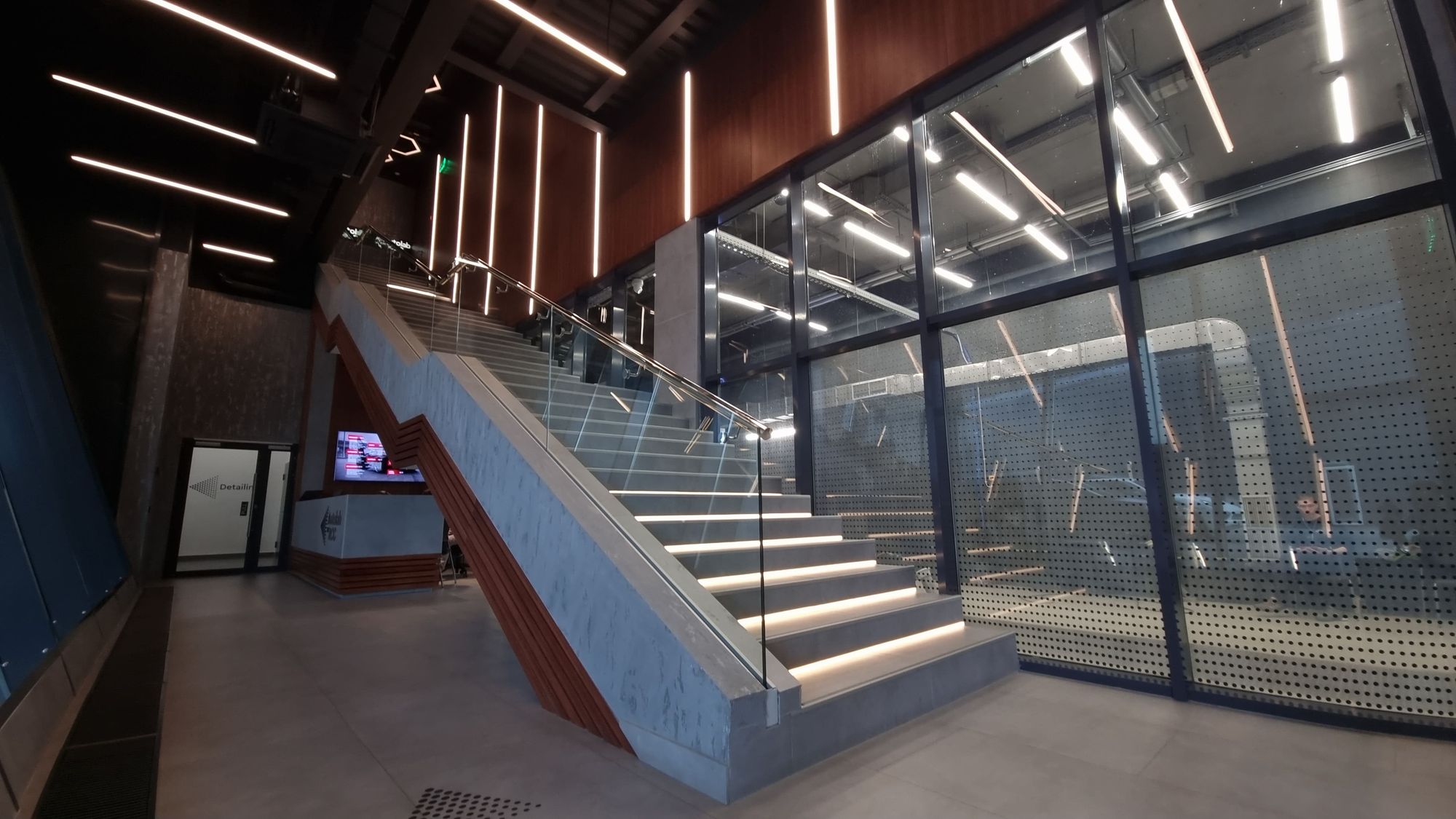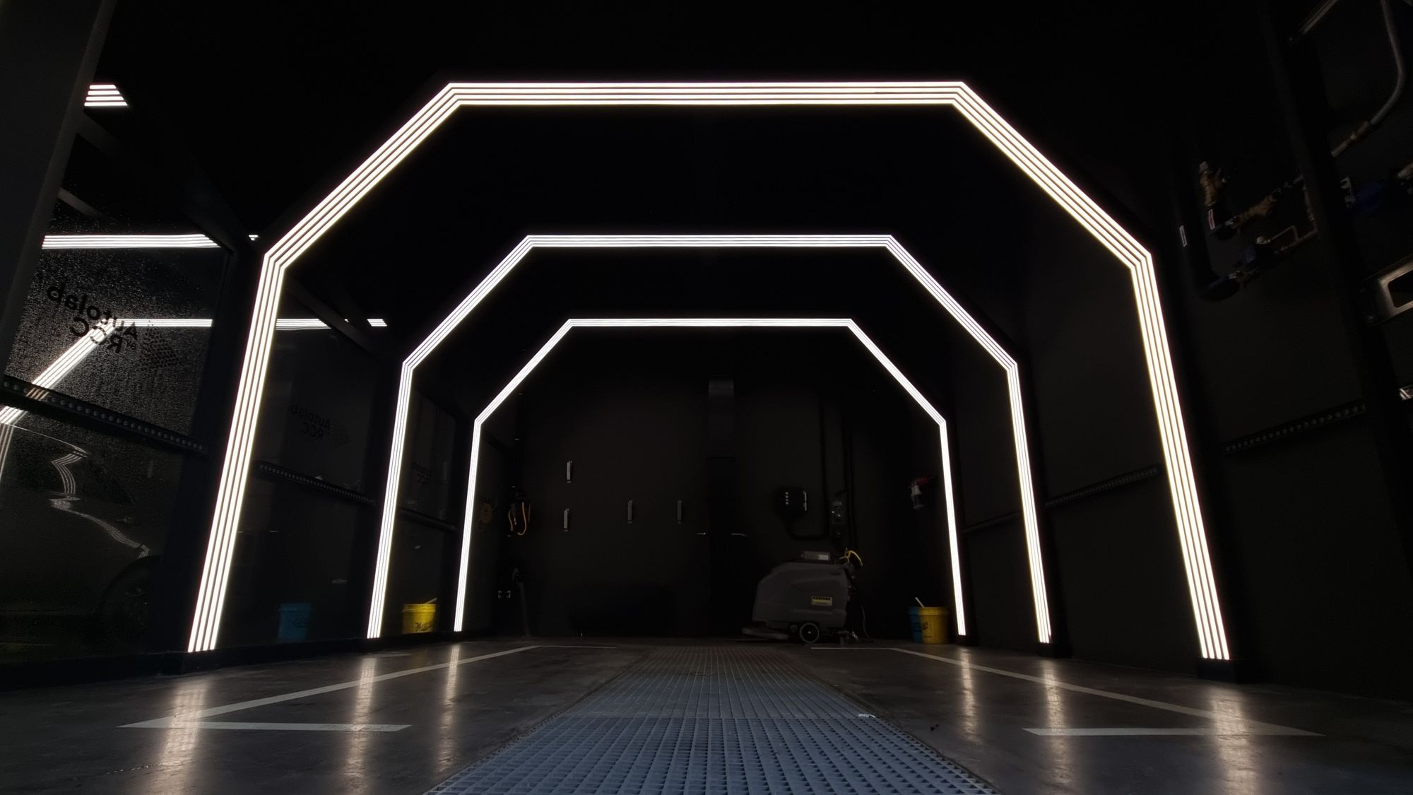 Зона автомойки просторна и функциональна. Световые порталы локально освещают каждую ячейку для мытья машин, а также погружают посетителей в атмосферу фильмов про автогонки и красивые машины. Свечение белого цвета контрастно смотрится на фоне темно-серого интерьера. При этом обстановка эмоционально не давит на посетителей благодаря пирамидальному участку крыши из стекла, через который проходит естественный свет.