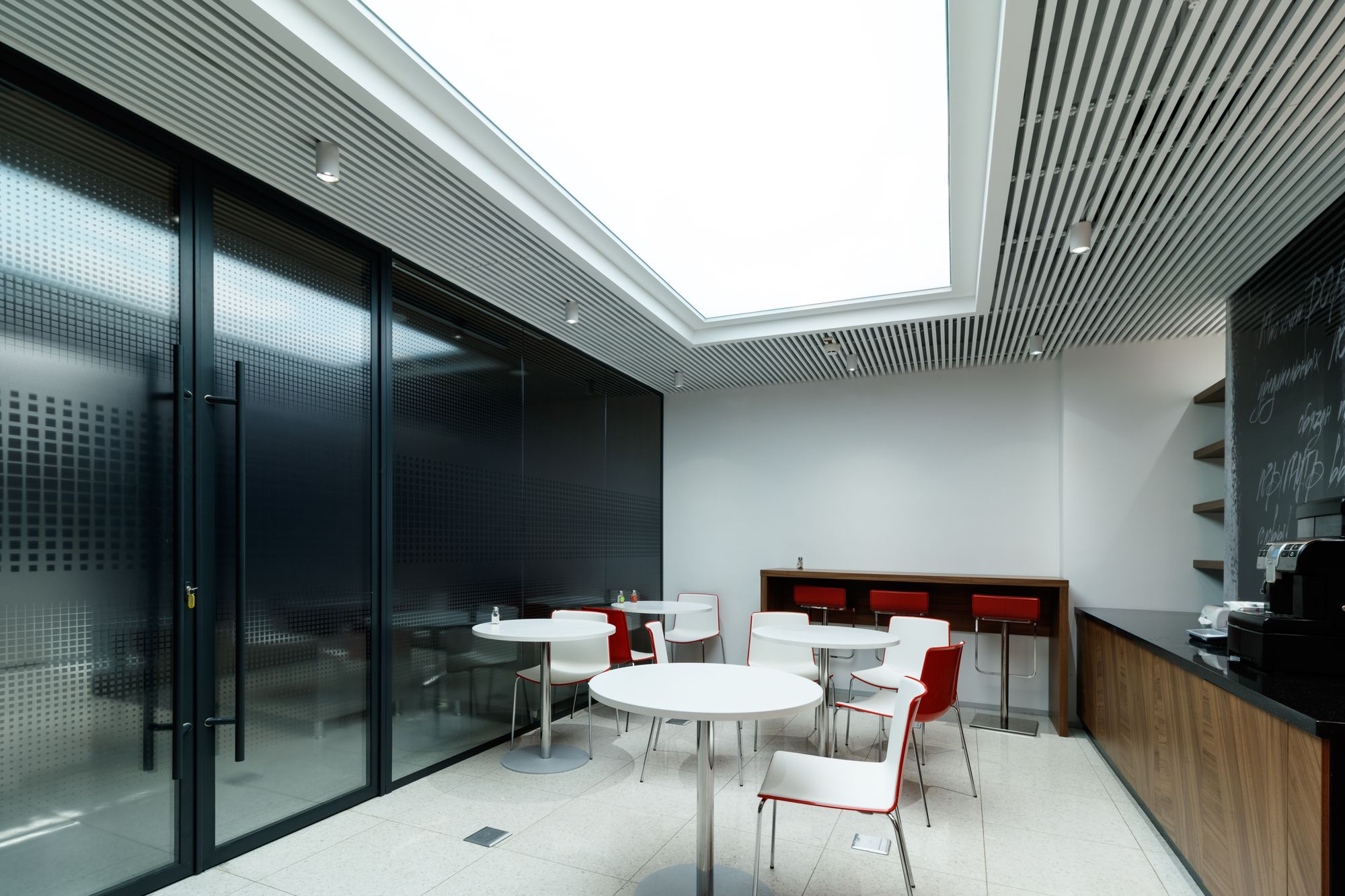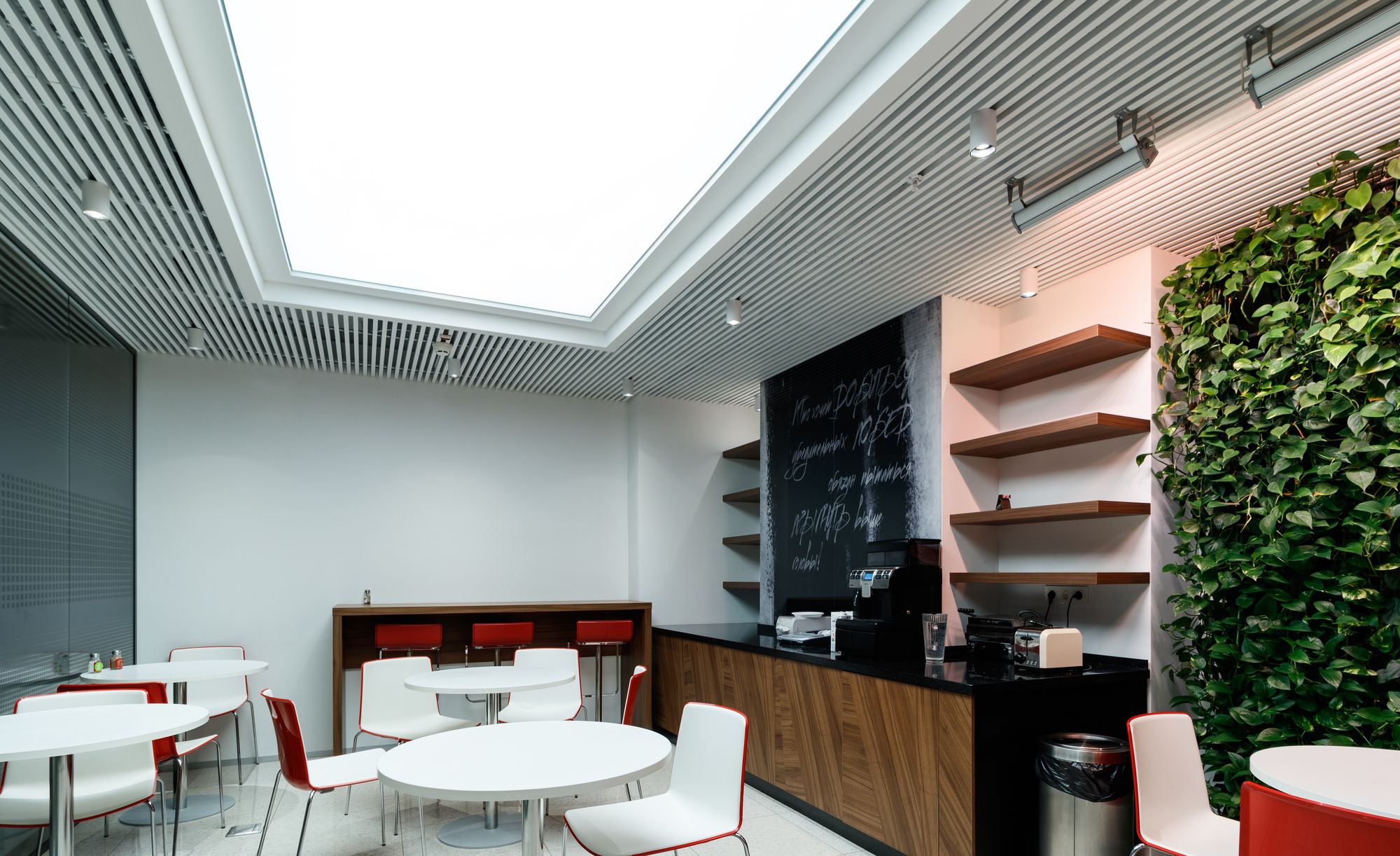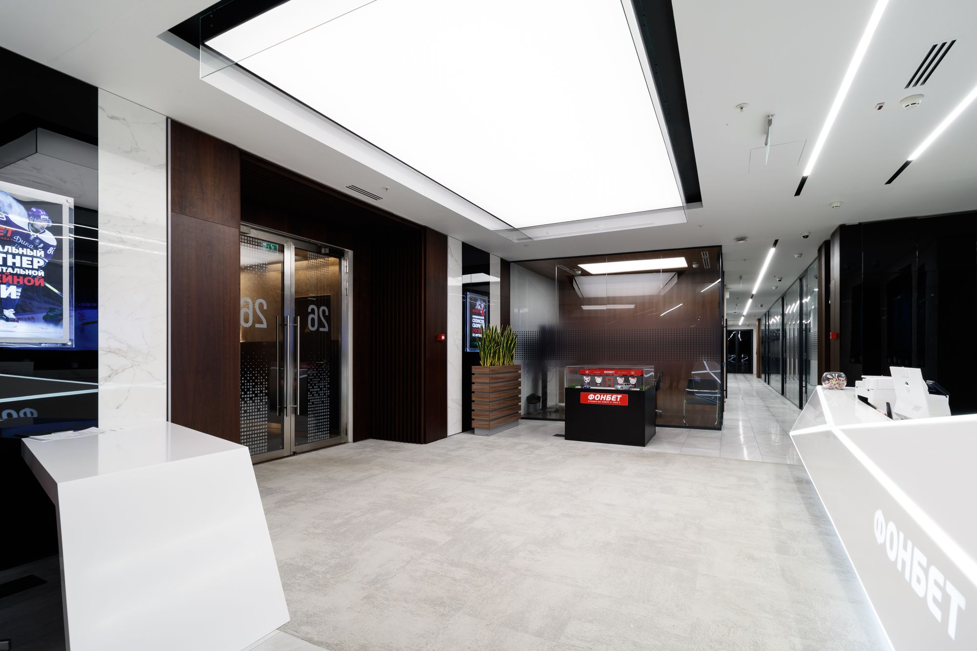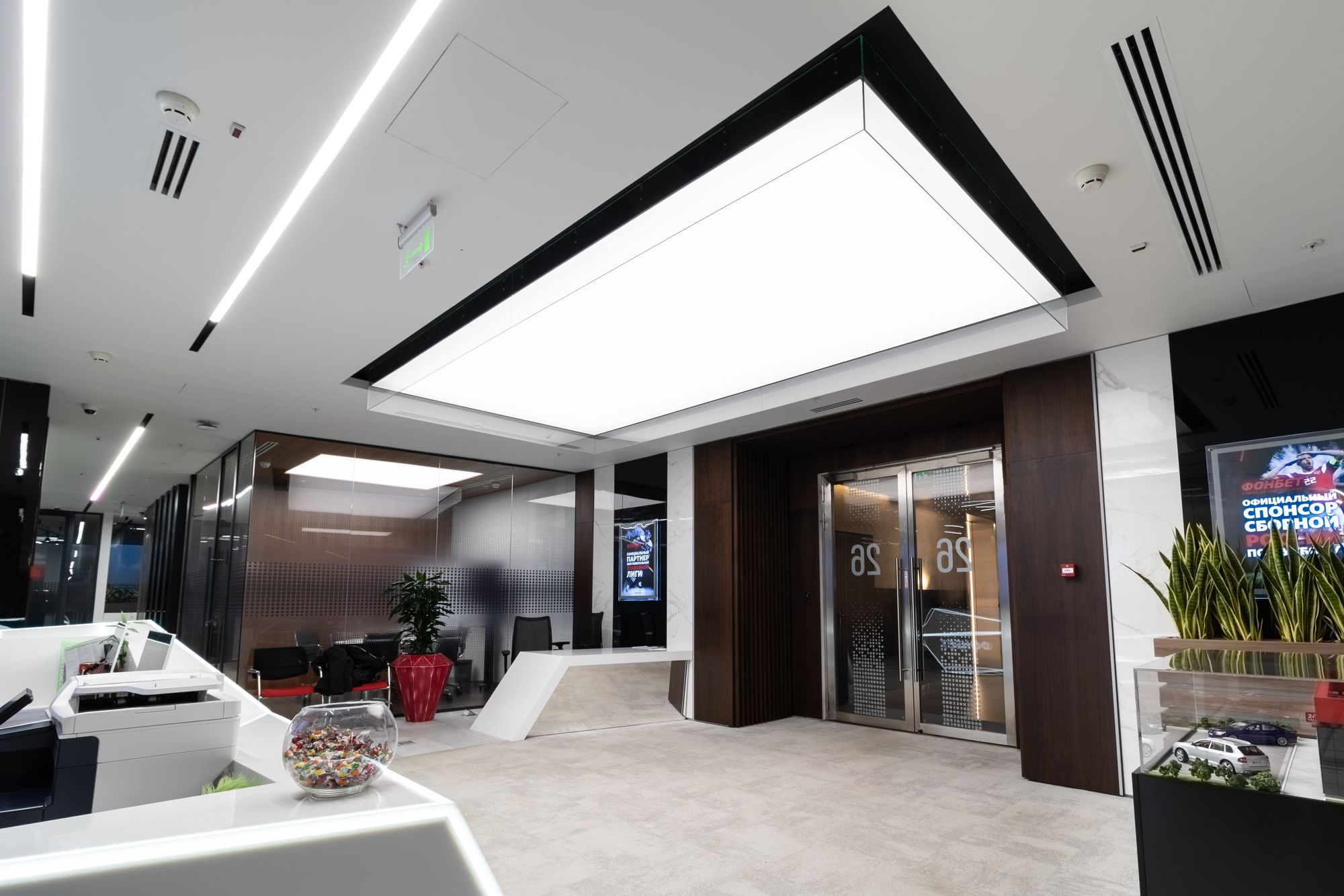 В качестве центрального элемента и основного освещения выступает большое прямоугольное полотно натяжного потолка, подсвеченное светодиодной лентой. Декоративным элементом является яркая световая полоса, которая отражается в зеркальных стенах и глянцевом потолке. За счет использования ярких световых акцентов помещение кажется более объемным.