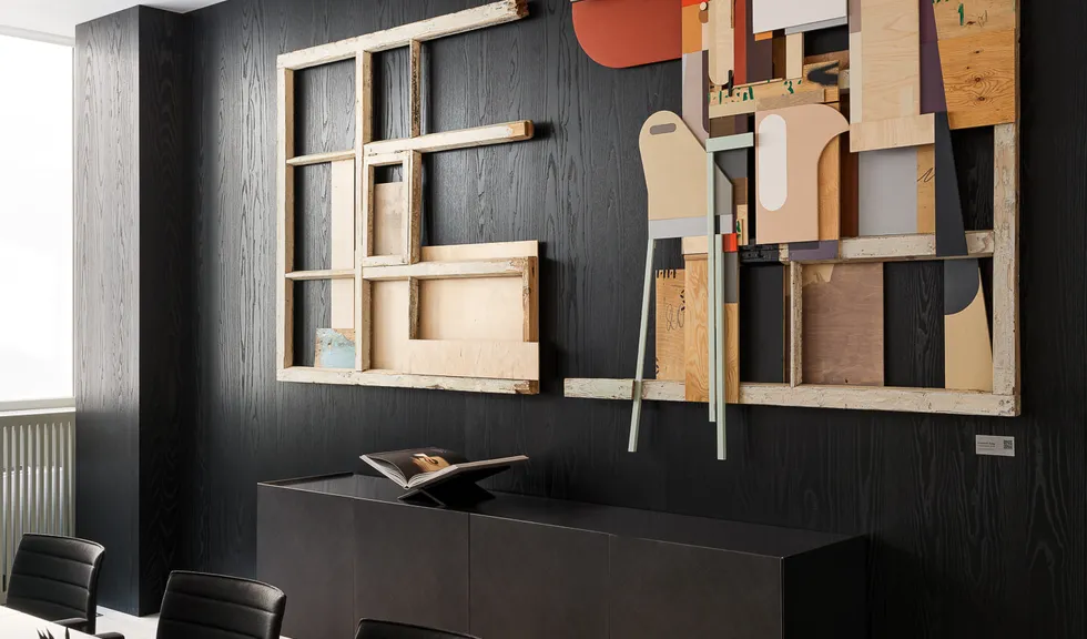 Использованные материалы: офисное пространство сделали более интересным за счет использования дерева глубокого черного цвета и натурального черного камня с выразительными белыми прожилками. Подобное сочетание материалов придало интерьеру солидность и глубину.