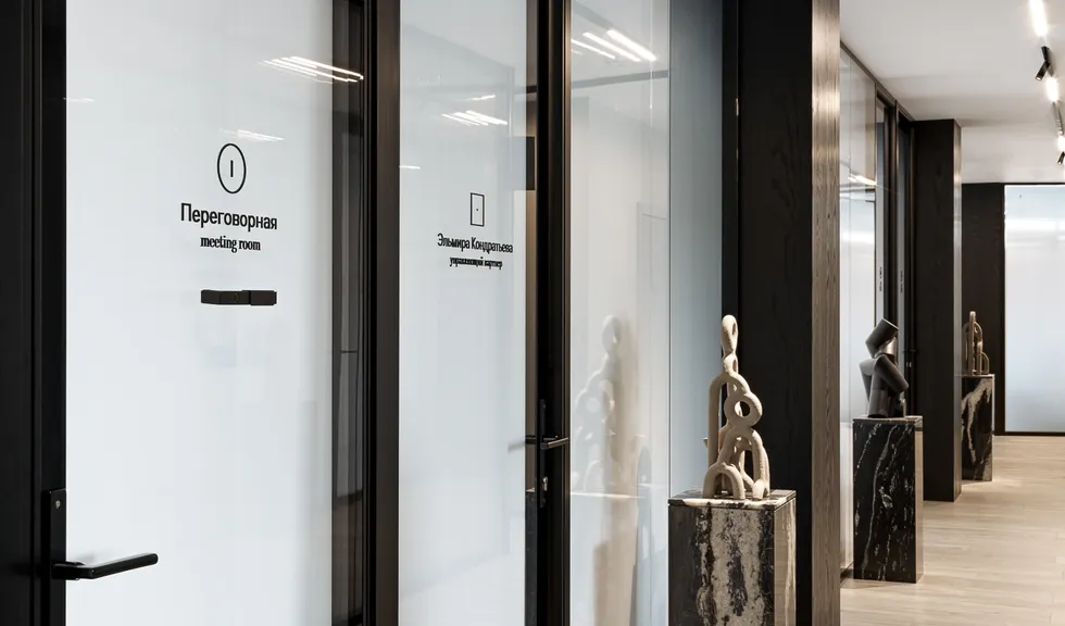 В офисе есть несколько переговорных комнат. Их оборудовали звукоизолирующими шторами. Такое гибкое решение позволяет при необходимости изолировать пространство, надежно ограждая переговоры от фонового шума, что критически важно для работы юридической фирмы.