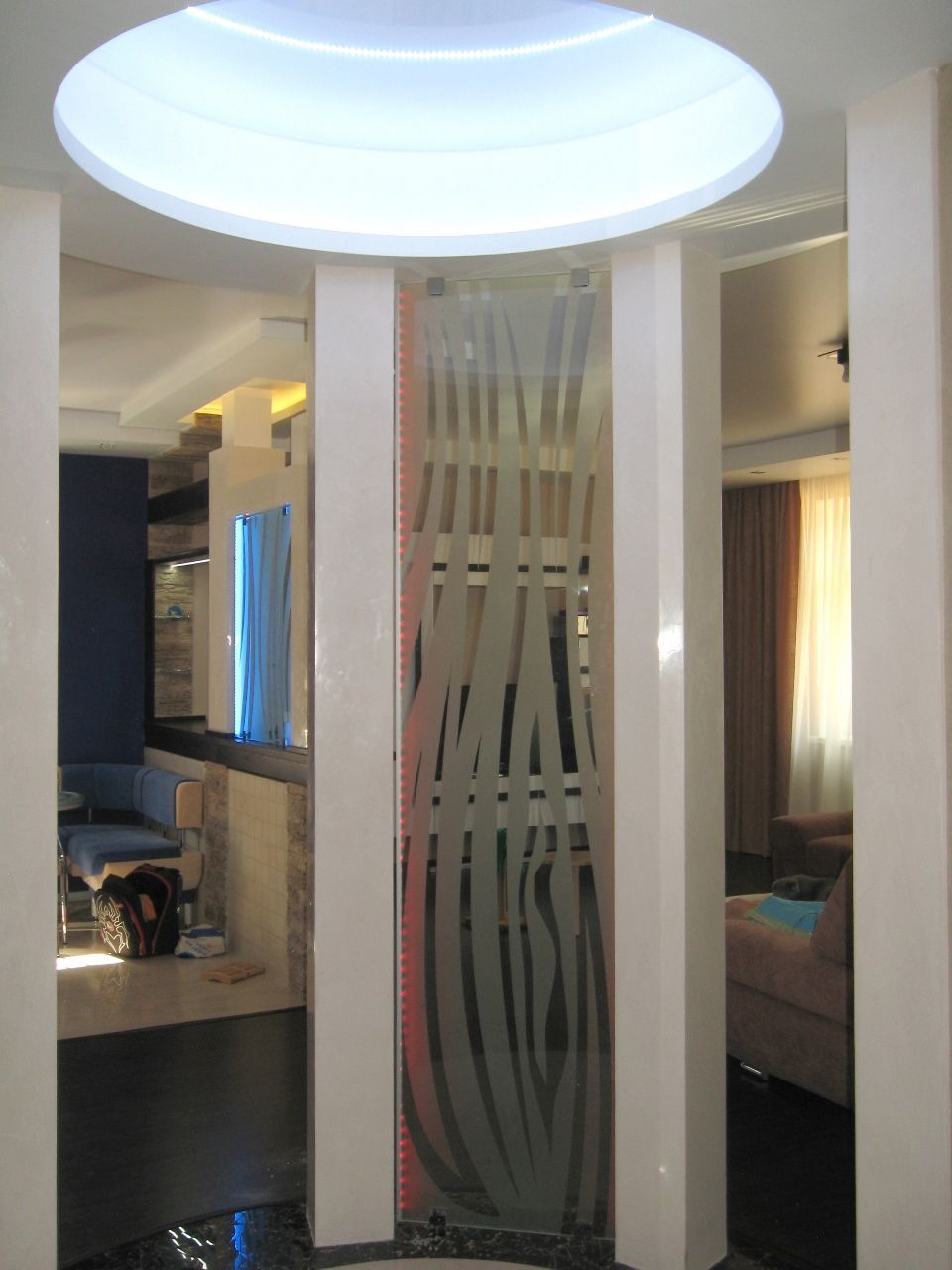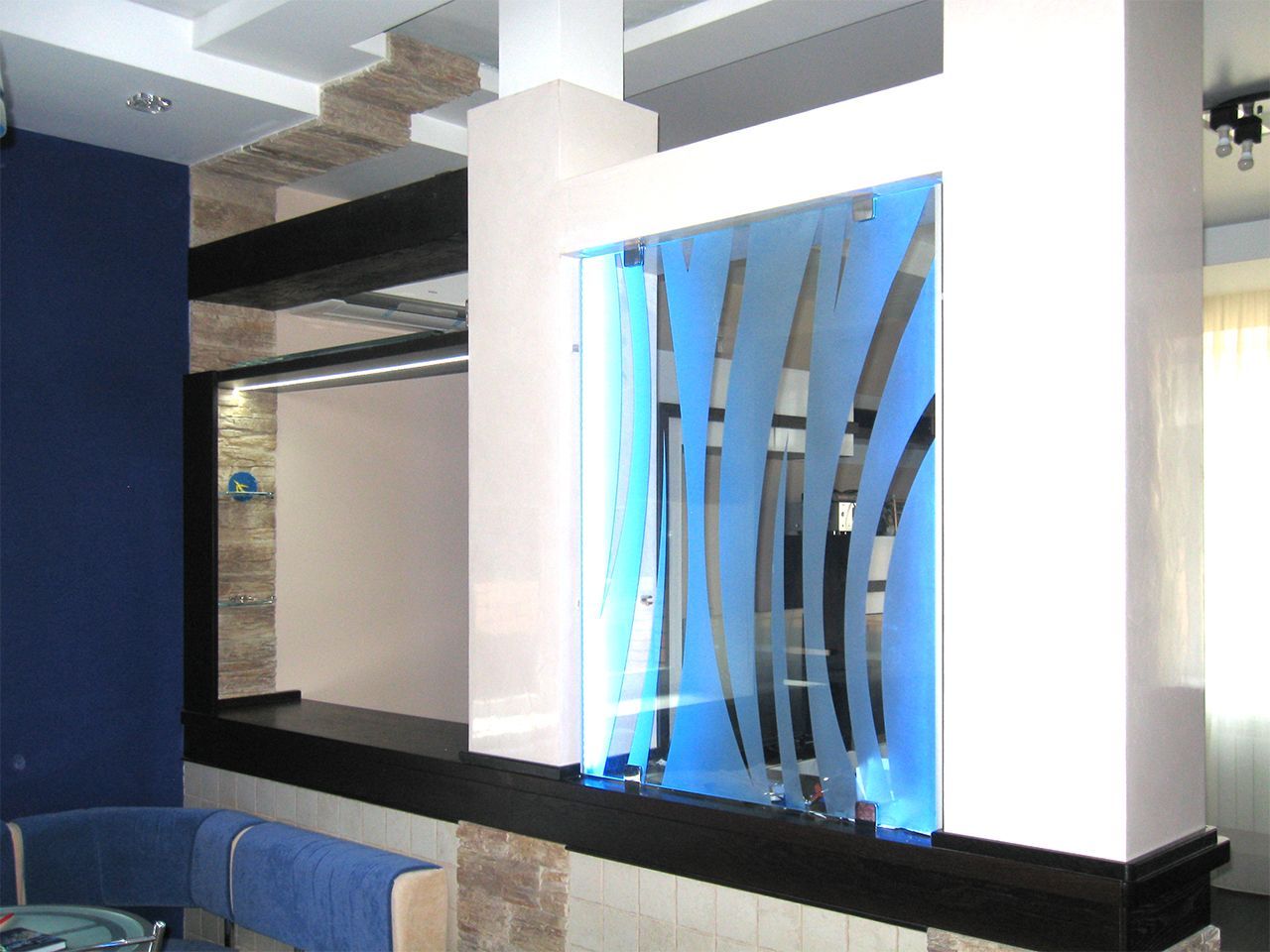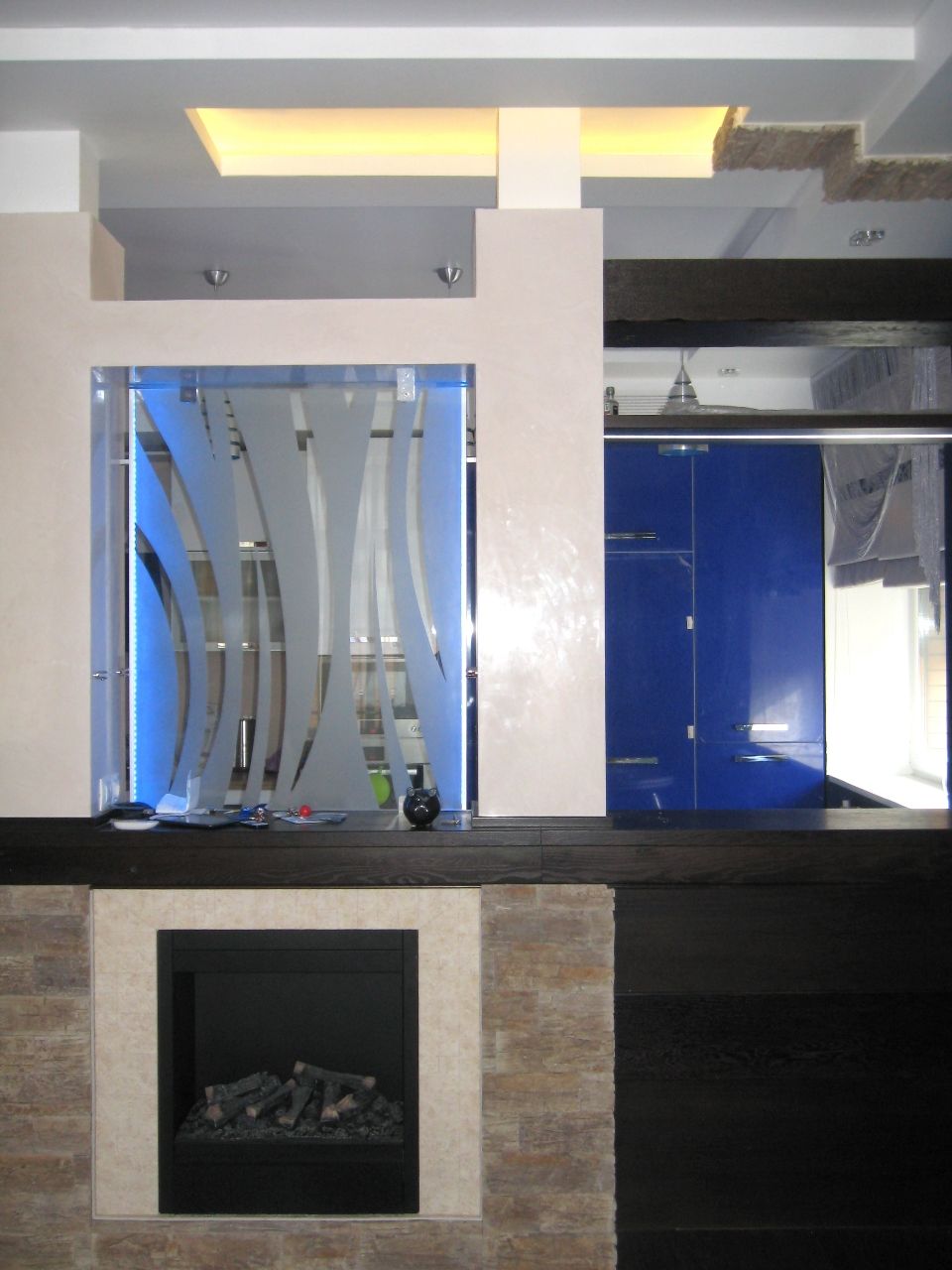 Светодиодная подсветка барной стойки с фальшкамином, подсветка потолочных ниш, а также стеклянных перегородок.