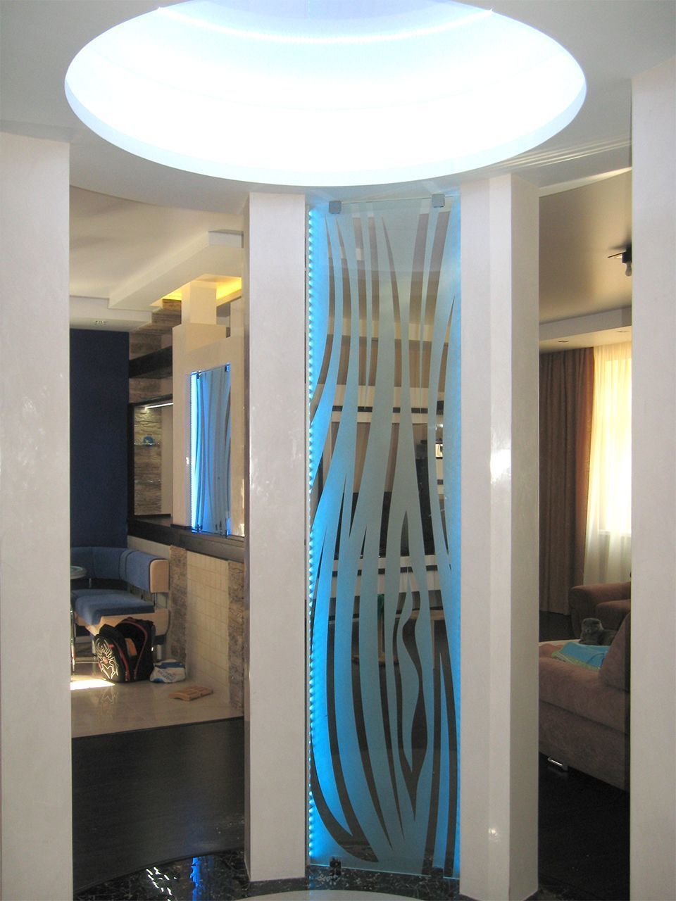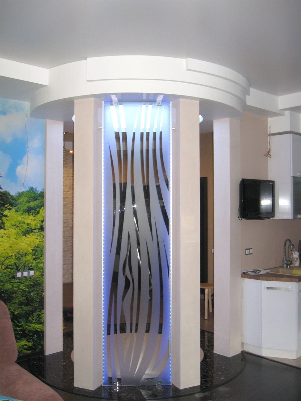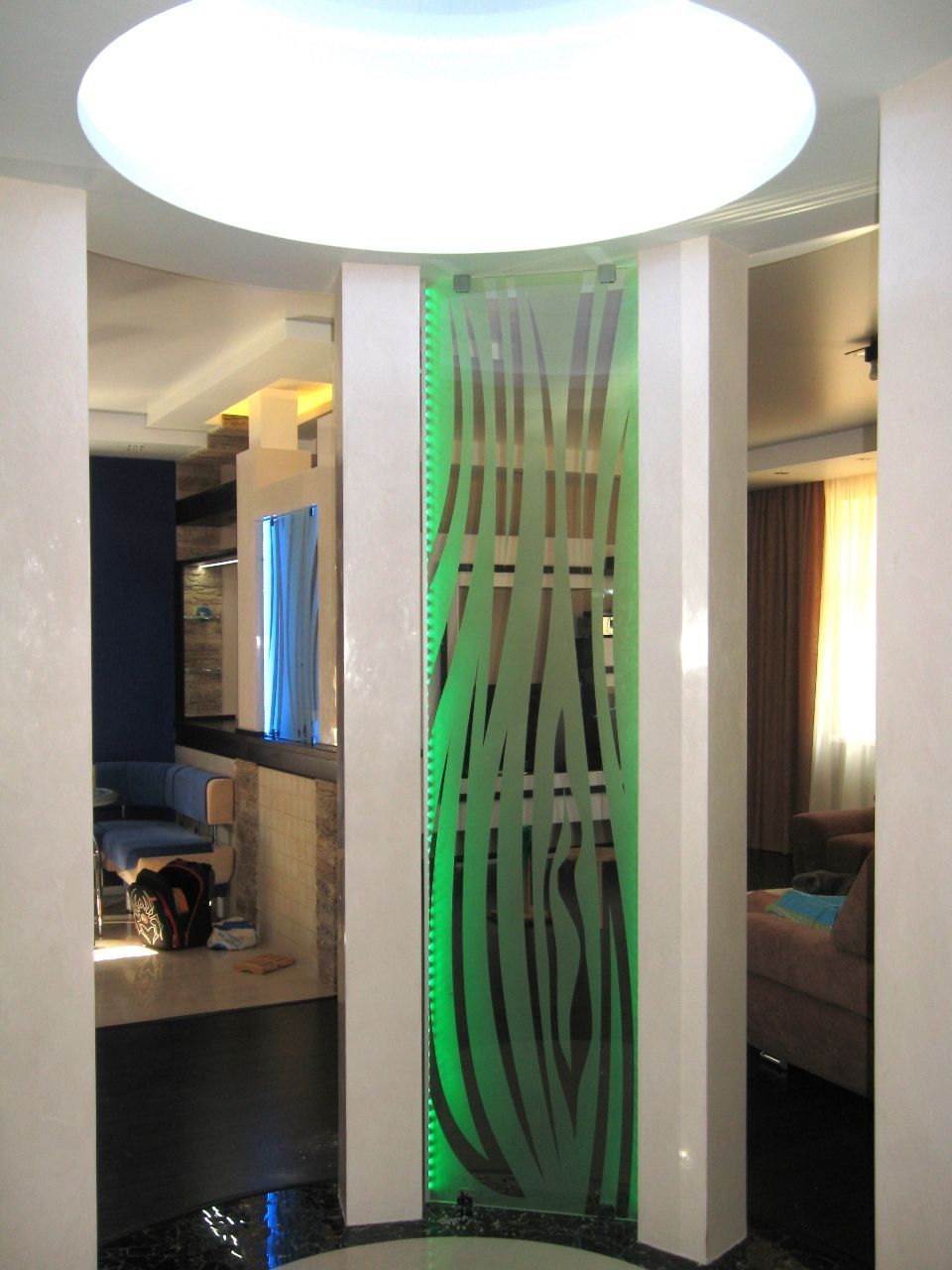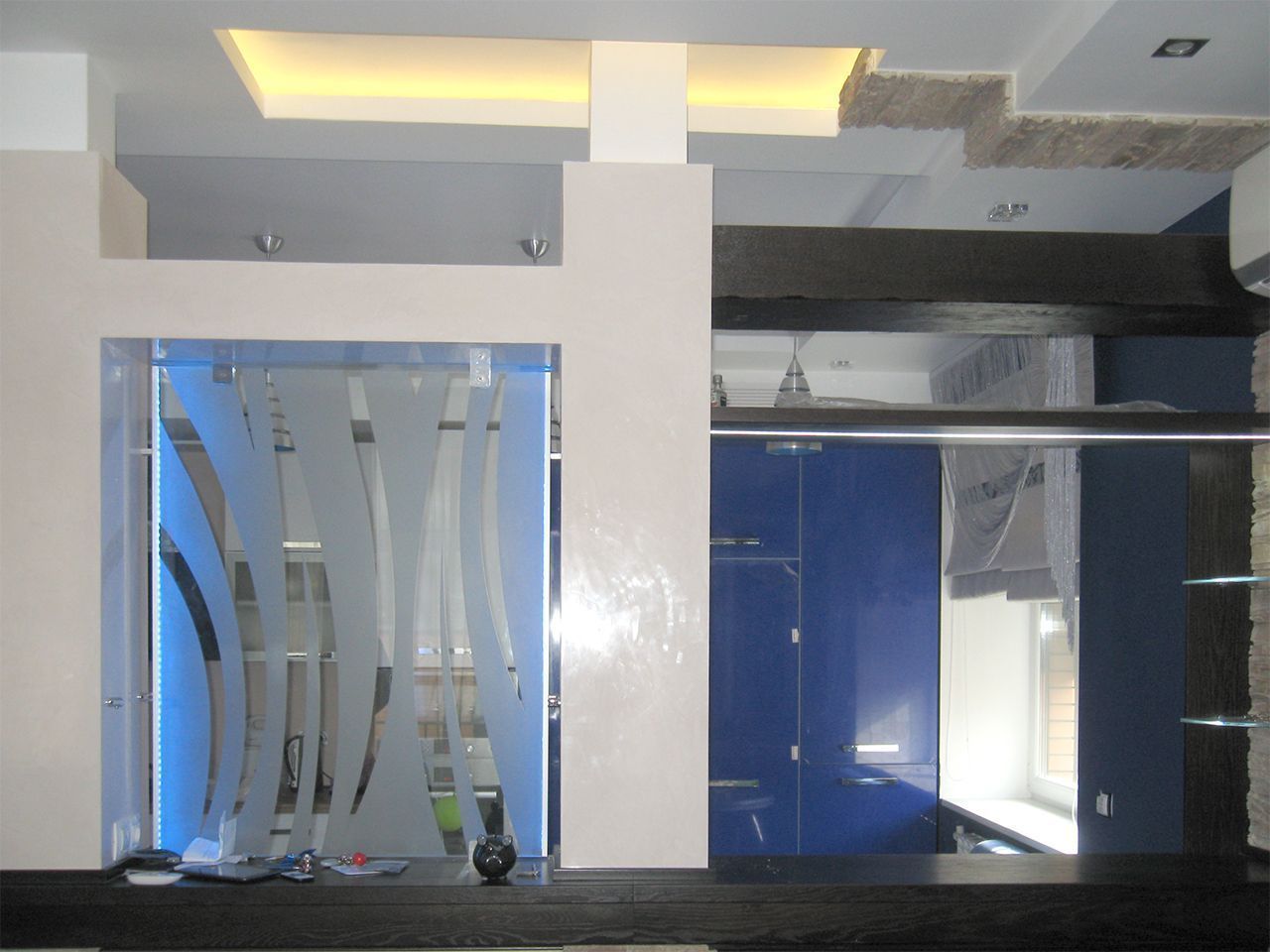 Светодиодная подсветка барной стойки с фальшкамином, подсветка потолочных ниш, а также стеклянных перегородок.