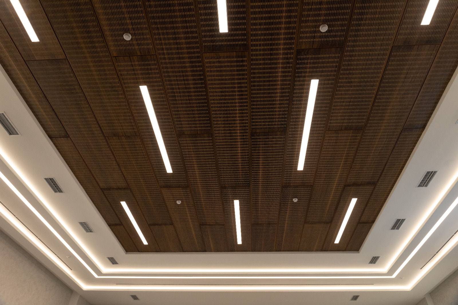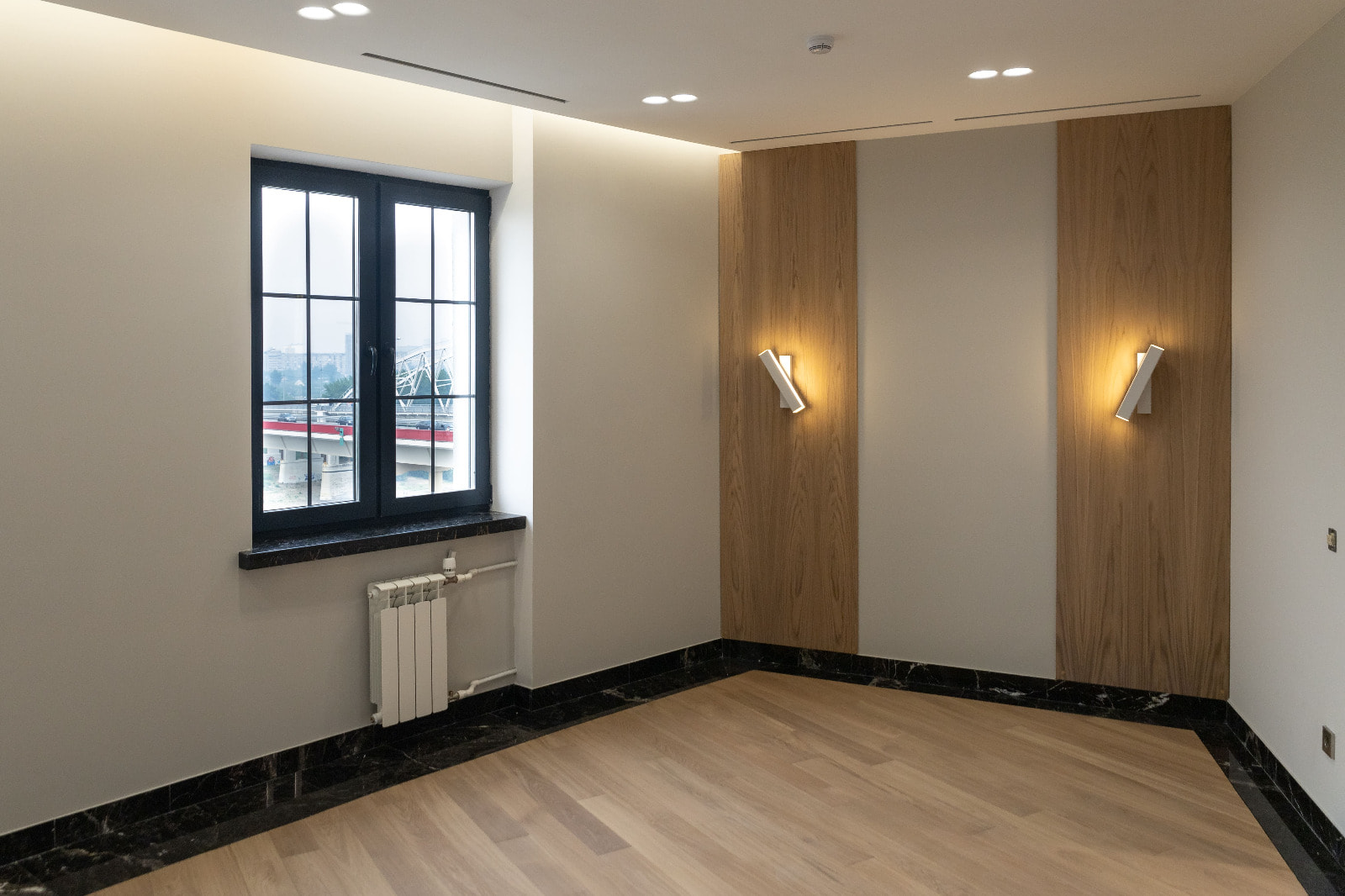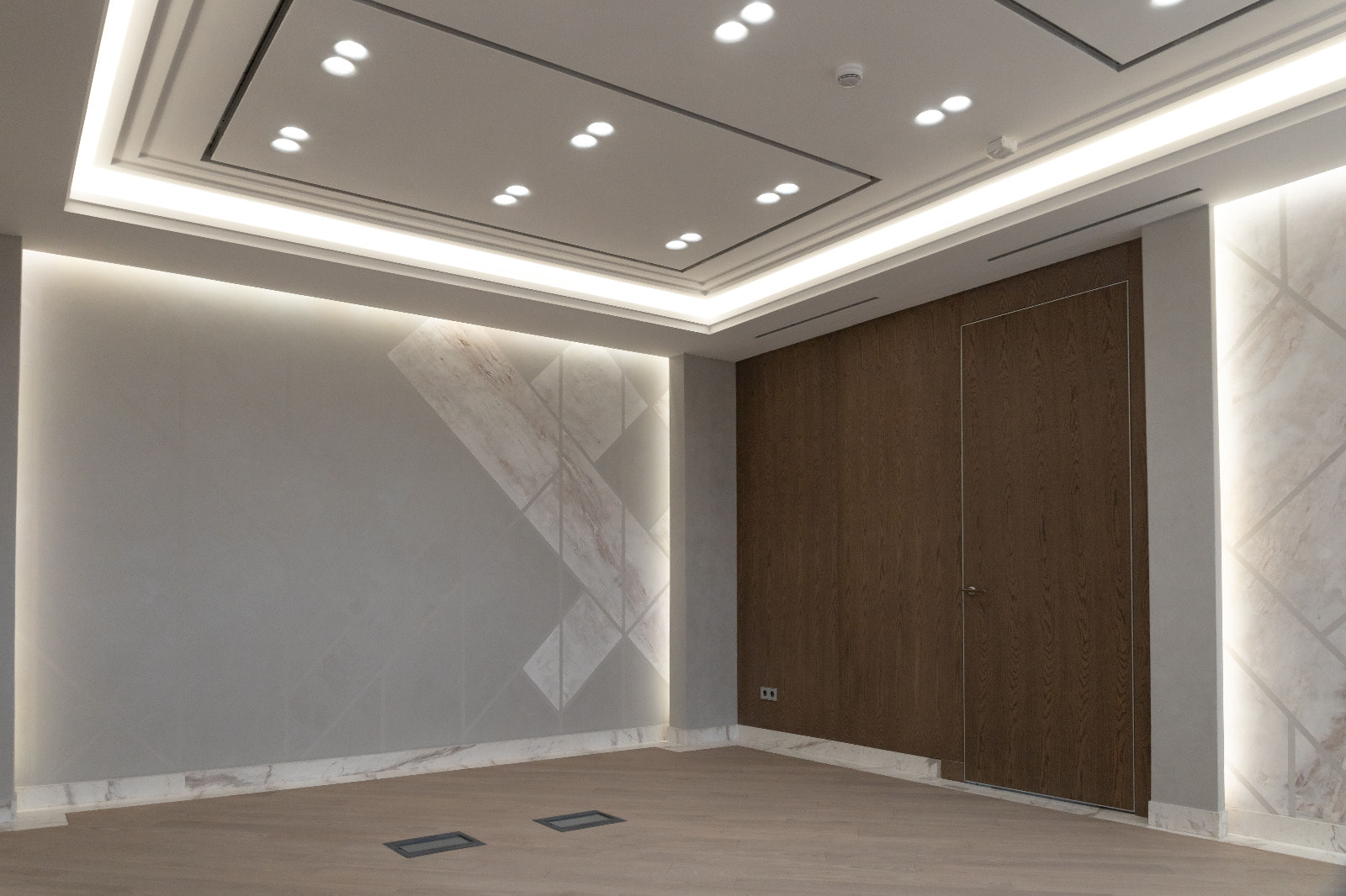 После капитального ремонта интерьер здания представительства ЯНАО стал более стильным, современным и в то же время — респектабельным. Разнообразные линии света — один из основных источников освещения в интерьере. Они не только создают освещение разных типов — от основного до декоративного, — но и повторяют геометрию отделки, тем самым гармонично вписываясь в пространство.