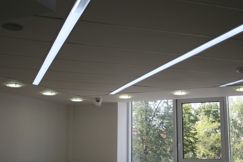 Светодиодное освещение торговых площадей в книжном магазине было выполнено двумя способами. Первый - освещение многоуровневого гипсокартонного потолка, второй - линейные светильники с матовым стеклом, встроенные в потолок Армстронг. Эти светильники создали эффект равномерных световых линий. В обоих вариантах освещения применялось светодиодная продукция торговой марки arlight®.