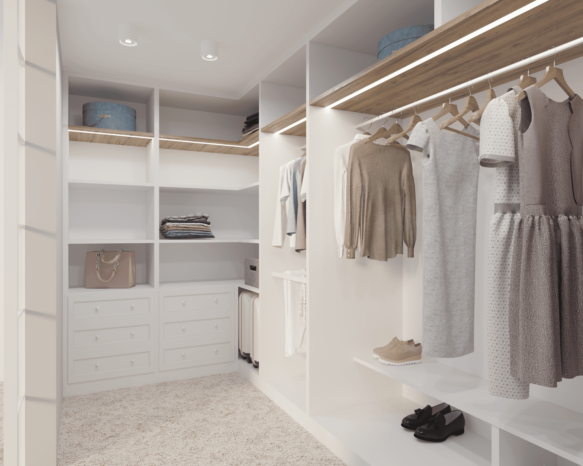 В проекте применялись анодированные профили с экраном и светодиодные ленты дневного белого свечения. Тонкие световые линии гармонично интегрированы в различные помещения. Другая часть основного освещения создана с помощью больших потолочных светильников, которые выразительно контрастируют с простыми линейными светильниками.